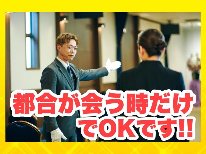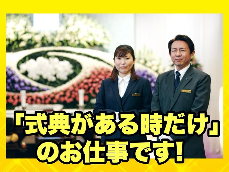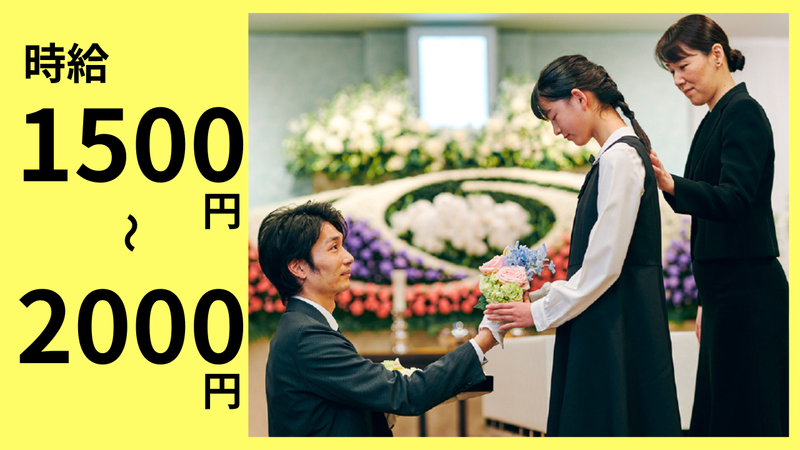 仕事内容 【葬儀式典のアシスタント】 のお仕事をお任せします。 ”お葬式がある時だけ”のお仕事です。 家事や育児を両立したい方、Wワークなどにピッタリです <勤務は出られる時だけでOK!> お葬式が入った時に場所と時間 お仕事をご案内しますので 入れる時に入ってもらいます!(1日3時間程度) *-* 【具体的には】 ・お客様のお出迎え、お見送り、受付 ・葬儀中の案内 ・最期のお別れ、出棺のお手伝い ・会場の後片づけ ★こんな方にピッタリです★ ・お客様から感謝を感じられる仕事がしたい。 ・人の役に立つ仕事がしたい。 ・プライベートとの両立をしたい。 ・柔軟な働き方ができる会社で働きたい。 <未経験の方でも大歓迎!> 先輩スタッフと一緒なので お任せするのは案内や受付や清掃のみ 難しい作業はありませんので安心!