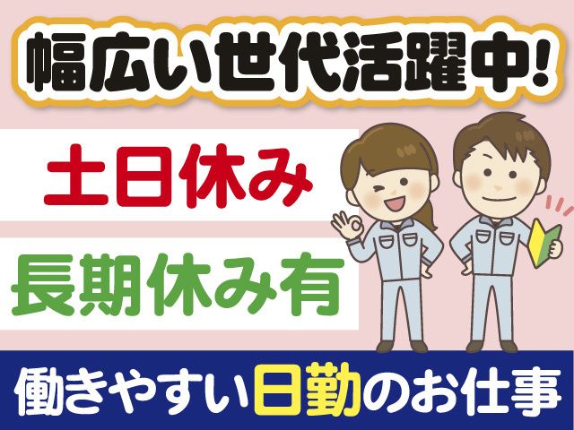 仕事内容 コネクタ組立の軽作業スタッフ募集! 勤務地は軽米町の工場で、 軽米インターから車で10分の場所です。 ・日勤で土日休み! ・長期休暇もあり(GW、お盆、年末年始) ・お友達同士のご応募もOK! ・中高年の方もご応募OK! ・工場見学OK 【業務内容】 スマホなどの、充電器のケーブルに 使用するコネクタを組み立てる 作業になります。 ・検査機での空気漏れ ・キズ等の外観検査 ・プレス機での加締め作業 ・袋詰め ・箱詰め その他付随する業務を お願いします。 女性でもできる簡単軽作業になります。 実際に、数名の女性が働いております。 【日勤で土日休み】 働きやすい日勤帯です。 土日休みなので、 プライベートの予定も 立てやすい職場環境です。 【幅広い世代活躍中】 ◎スグに覚えられる軽作業! ◎20代30代40代50代60代の男女活躍中! ◎主婦(夫)パートの方も活躍中! ◎中高年の方も活躍中! ◎学歴・経験不問の工場内軽作業! ◎工場・製造業の未経験者もOK! ◎異業種・異職種からの転職でも安心! ◎パート・アルバイト・フリーターから、 派遣デビューしてみたい方もOK! ◎ハローワークでお仕事探し中の方もOK! 【こんな経験活かせます!】 現在働いている方々は、 前職で電気・機械検査、製品組立、 工場製造、機械オペレーターなど 様々な経験をお持ちです! 当てはまるものがあれば、即戦力として 活躍可能ですよ! 前職の雇用形態も パート・アルバイト・正社員など 問わず応募できます! WEBは24時間応募可能! ご質問も随時受付しておりますので、 お気軽にお電話下さい!