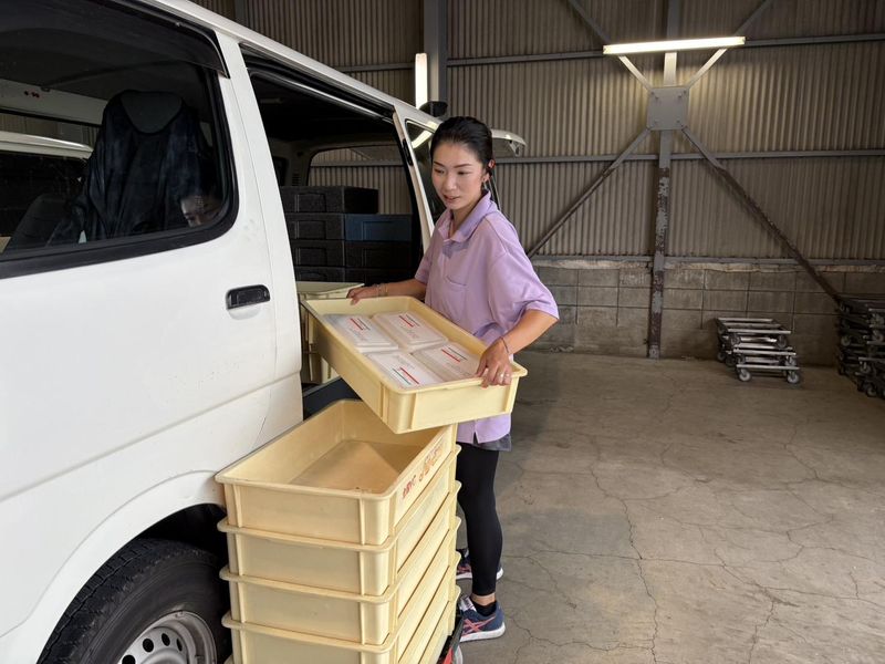 企業向けお弁当のハイエースでのデリバリースタッフ