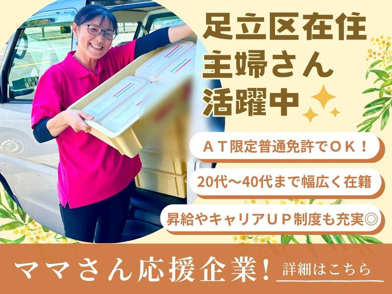 仕事内容 企業へのお弁当配送のお仕事です! 足立区鹿浜の車庫で一度社用車に乗り替え、 担当エリアへの配送に向かいます。 1日あたり25~35件ほどを担当します。 【1日の流れ例/子育て中のママSさん✨】 ▼07:30 鹿浜の本社にてお弁当を車に積み込み ▼09:00~10:00 ハイエースで配送! ▼12:00 配送終了、終了報告、休憩(日替わり弁当無料♪ ▼13:00 空き箱回収 ▼16:00 残業せずにお仕事終了!お疲れさまでした! ☕頑張る方はしっかり評価✊  ̄ ̄ ̄ ̄ ̄ ̄ ̄ ̄ ̄ ̄ ̄ ̄ ̄ ̄ AT免許さえあれば未経験でも始められるお仕事! ✅頑張りに応じて給与アップ✨ ✅もっと頑張りたい方はキャリアアップも! ✅子育てが落ち着いたら社員になりたい!もOK✊ 勤続年数の長い方も多く、 柔軟な働き方が出来るから、 「子ども成長に合わせてパートを探し直さなきゃ…」 なども心配しなくて大丈夫です♪ ハローランチは頑張る方を応援します✨