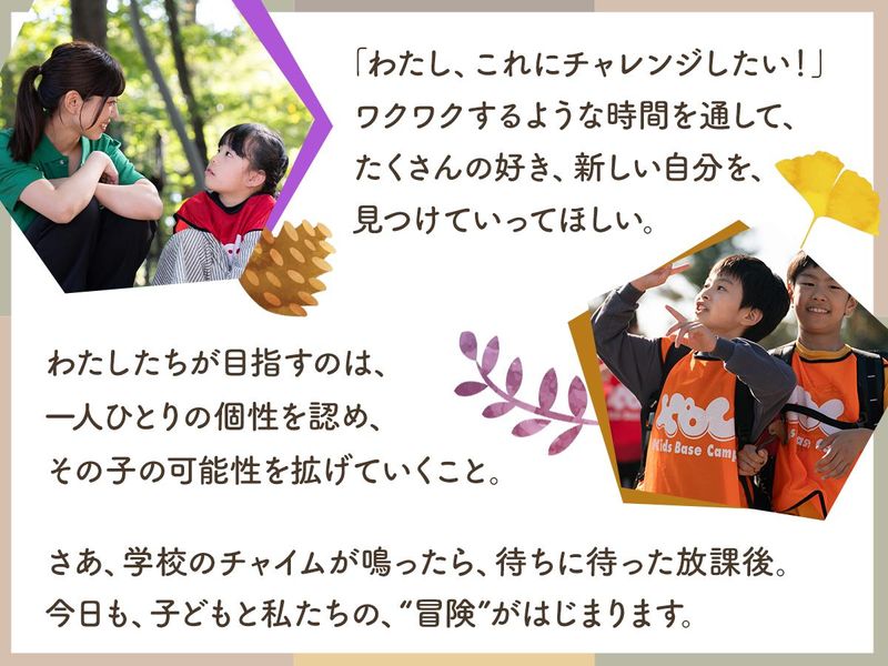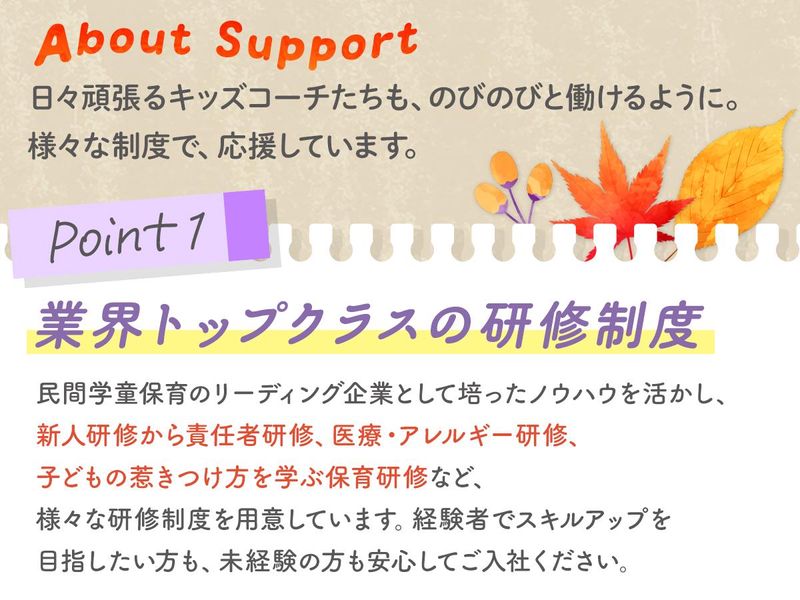 仕事内容 ✨2026年4月新規受託が決定  ̄ ̄ ̄ ̄ ̄ ̄ ̄ ̄ ̄ ̄ ̄ ̄ ̄ ̄ ̄ ̄ ̄ ̄ ̄ ̄ 練馬区「みらい青空学園ねりっこクラブ」江古田駅/池袋駅エリア ※新施設・既存施設ともに事業拡大のため増員募集中 ✨この求人のアピールポイント  ̄ ̄ ̄ ̄ ̄ ̄ ̄ ̄ ̄ ̄ ̄ ̄ ̄ ̄ ̄ ̄ ̄ ̄ ̄ ̄ ✔ 未経験OK・20代~40代を中心に活躍中◎ ✔ 年間休日120日+各休暇制度&充実の福利厚生 東急グループならではの安心感と働きやすさ◎ ✔ 子育て支援制度&育休取得率も100%! 子育てとの両立を会社がサポート! ✔ 研修制度が充実!未経験から活躍できる◎ 自分らしいキャリアを描いて働く! ✔ 5年連続「働きがいのある会社」 ベストカンパニー選出! 東急グループの一員として、子育て支援事業を展開する当社。 学校でも家庭でもない「子どものサードプレイス」をコンセプトに、学童保育・児童館を74施設、保育園5園を運営しています。 今後の事業拡大に向け、キッズコーチ(学童保育・児童館指導員)を増員募集! わたしたちと一緒に、子どもの成長をサポートしていきませんか。 ※2026年4月入社まで可 ✨仕事内容  ̄ ̄ ̄ ̄ ̄ ̄ ̄ ̄ ̄ ̄ ̄ ̄ ̄ ̄ ̄ ̄ ̄ ̄ ̄ ̄ 学童保育・児童館でキッズコーチとして、一人ひとりの個性や可能性を引き出す「コーチング」で子どもたちの成長をサポート。 放課後と長期休みを価値ある時間にするために、日常プログラムはもちろん、学校や家庭では経験できないイベントプログラムを通して子どもたちの「社会につながる人間力」を育んでいます。 また、学校での出来事を聞いたり、一緒にイベントを楽しんだり、時には保護者や先生にも言えないような相談にのることも。 キッズコーチは子どもの心の拠り所となる存在です。 >>具体的には ・生活全般の保育業務 ・イベントプログラムの企画や運営 ・保護者とのコミュニケーション ・上記に関連する事務業務 現在、募集している「公設民営型(学童保育・児童館)」の施設は、教員の方と子どもたちの情報交換をしたり、地域の方を招いたイベントを企画するなど、学校や地域との連携もやりがいの一つです。 ✨1日の流れ(学童保育の例)  ̄ ̄ ̄ ̄ ̄ ̄ ̄ ̄ ̄ ̄ ̄ ̄ ̄ ̄ ̄ ̄ ̄ ̄ ̄ ̄ 10:00 出社・子どもたちを迎える準備 12:00 ミーティング 14:30 子どもたちを出迎え 16:30 外遊び、おやつの提供 18:00 子どもたちのお見送り 18:30 翌日の準備 19:00 退社 ✨充実した研修制度  ̄ ̄ ̄ ̄ ̄ ̄ ̄ ̄ ̄ ̄ ̄ ̄ ̄ ̄ ̄ ̄ ̄ ̄ ̄ ̄ 民間学童保育のリーディング企業として培ったノウハウを活かし、「子どものほめ方」「コーチング」など具体的な保育研修から、医療・アレルギーやビジネスマナーなど専門知識を学ぶものまで多彩な研修プログラムを用意しています。 大学で教員免許を取得したけれど、この業界は未経験という方も、経験者でスキルアップを目指したい方も安心して入社いただけます。 研修の一例 ◎新人研修(保育基礎/リスクマネジメント/コーチング/学童保育基礎知識) ◎階層別研修(リーダー候補/責任者/エリアマネージャー/2,3年目研修) ◎保育研修(コーチング/ひきつけ方/ほめ方/けんかの仲裁) ◎専門分野研修(医療/アレルギー/上級救命) ✨資格取得支援&充実の福利厚生  ̄ ̄ ̄ ̄ ̄ ̄ ̄ ̄ ̄ ̄ ̄ ̄ ̄ ̄ ̄ ̄ ̄ ̄ ̄ ̄ ✔ 資格取得サポート(保育士や放課後児童支援員など) ✔ 医療費補助(通院時3,000円以上に対し支給) ✔ 東急グループ施設割引(宿泊施設等の利用補助) ✔ 各種お祝い金:結婚や出産、入学祝い金等 ✔ 東急グループ保険加入 ✔ 引越支援一時金(10万円) ✔ 住宅支援制度:独身寮(規定あり) ✔ 子育て支援制度 ・産前産後休暇 ・育児休業(現在、育休取得率100%) ・お子さんが小学校3年生までの時短勤務 ・KBCほいくえん/キッズベースキャンプ優先利用&割引 ・家族看護休暇 ✔ Wワーク制度(スキルアップサポート) ✔ 退職金制度 ✨勤務地について  ̄ ̄ ̄ ̄ ̄ ̄ ̄ ̄ ̄ ̄ ̄ ̄ ̄ ̄ ̄ ̄ ̄ ̄ ̄ ̄ 以下の練馬区内やその他、新宿区や杉並区内等に多数あり ✔ 上石神井児童館(上石神井駅) ✔ 石神井小ねりっこクラブ(石神井公園駅) ✔ 光が丘春の風小ねりっこクラブ(光が丘駅) ✔ 南が丘小ねりっこクラブ(練馬高野台駅) その他、新宿区(新宿/高田馬場/早稲田など)や大田区(蒲田/大森/馬込など)、目黒区(目黒/中目黒など)で募集中♪ 面接時、お住まいの最寄り駅と最新の募集状況をもとに入社時の勤務場所を確認させていただきます。 ✨社員インタビュー  ̄ ̄ ̄ ̄ ̄ ̄ ̄ ̄ ̄ ̄ ̄ ̄ ̄ ̄ ̄ ̄ ̄ ̄ ̄ ̄ Aさん(28歳・入社3年目) 「未経験からのスタートでしたが、先輩たちのサポートのおかげで安心して仕事を始めることができました。 子どもたちとのふれあいを通じて、自分自身も成長していると感じています。毎日が新しい発見の連続で、とてもやりがいを感じています。」 Bさん(31歳・入社5年目) 「元々は銀行員でしたが、子どもたちと関わる仕事がしたいと思い、転職を決意しました。 今では、転職して良かったと感じています。キッズベースキャンプでは、子どもたちの成長