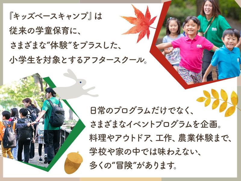 選考プロセス 【採用フローについて】 ①応募・書類選考 ②一次・二次面接(一次面接はオンライン/二次面接は会場開催) ③内定 ※一次選考については、1クリックで予約が可能なフォームをメール送付 ※ご応募から内定まで約2週間~1ヶ月程度を予定 【会社情報】 会社名:株式会社東急キッズベースキャンプ 本社:神奈川県川崎市中原区小杉町1-403武蔵小杉タワープレイス18階 【問い合わせ先】 株式会社東急キッズベースキャンプ・採用担当 MAIL:recruit@kidsbasecamp.com