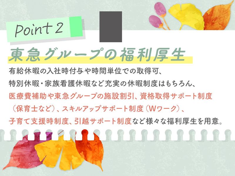 【保険制度】 雇用保険、労災保険、健康保険、厚生年金 待遇・福利厚生 【福利厚生】 【雇用形態】 正社員 ※試用期間3カ月間あり(条件に変更はありません) 【給与】 月給235,000円~302,000円 ・処遇改善臨時特別手当(11,000円)を含む ・固定残業代(13時間)を含む ※固定残業代は残業がない場合も支給し、超過分は別途支給 【別途手当あり】 ・責任者手当 1万~3万円 ・管理職手当 5万円~ ・通勤手当 ・子ども手当 【福利厚生】 ・医療費補助 ・東急グループ施設割引利用 ・各種お祝い金 ・東急グループ保険加入 ・引っ越し一時金(10万円) ・産休、育休制度 ・お子さんが小学校3年生までの時短シフト利用 ・KBCほいくえん/KBC優先入園、割引制度あり ・家族看護休暇 ・保育士資格,放課後児童支援員取得支援制度 ・住宅支援制度 (独身寮)※規定あり ・Wワーク制度 ・退職金制度