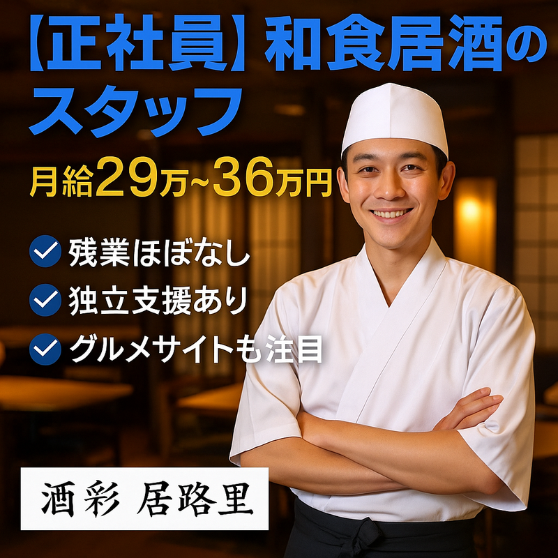 仕事内容 ‐°˖✧-和食居酒屋「酒菜 居路里」(月灯里)で一般的な調理業務を幅広くお任せします‐°˖✧- 「家族も料理も両立したい」そんなあなたへ—— 本格和食を学びながら、定時退社で家族との時間もしっかりとれる職場です。 ★ー✨ー働くメリットー✨ー★ 【残業ほぼなし】 より効率的な調理体制を構築し、定時退社が可能 【高待遇スタート】 月給28~36万円+6ヶ月ごとのインセンティブ 【キャリアアップ支援】 調理師免許取得支援の実績あり、将来の独立もサポート 【本格和食が学べる】 全国グルメガイド掲載店、季節料理・サービスに自信あり 【働きやすい環境】 コロナ対策後も柔軟なシフト設計・家族優先の経営スタイル ★ー✨ー★ー✨ー★ ✅ 残業ほぼなし!プライベートも大切にできる → 調理効率を徹底追求!定時での退勤が基本です。長時間労働に悩んでいた方も安心! ✅ スキルや経験に応じてしっかり評価! → 給与もポジションも“あなたの実力”に見合った形でスタート!調理師免許の取得も会社がしっかりサポート! ✅ 本格和食が学べる&評価される職場! → 季節料理のクオリティが評価され、全国の有名グルメガイドにも掲載実績あり!やりがいと誇りを持てる環境です。 *.。*.。*.。*.。*.。*.。*.。*.。 【酒彩 居路里】 はこんなお店♪ 席数・雰囲気 ・全100席のゆったりした空間 ・個室/掘りごたつ/カウンターと多彩な席タイプあり ・落ち着いた和モダンな雰囲気で、居心地の良さが魅力! お客様層 ・ファミリーからビジネスマン、カップルまで幅広く来店 ・週末は団体予約も多く、宴会ニーズにも対応 オーナーの想い ・“良き父親”でもあるオーナーは、家族との時間を大切にしながらお店を運営 ・コロナ禍を経て、「効率だけでなく、働き方やお店のあり方」を真剣に見直しました *.。*.。*.。*.。*.。*.。*.。*.。