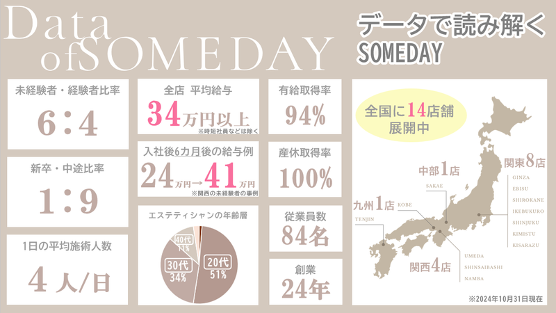 求めている人材 ・未経験歓迎 ・学歴・経験不問 ※エステ経験1年以上の方は条件面で優遇を検討しますので面接時にご相談ください。 現在活躍しているスタッフはほとんどが未経験入社。 前職、保育士・幼稚園教諭・美容部員・飲食店スタッフ・アパレルスタッフ・保険営業・バスガイドなどなど様々。 全くの未経験からでもSOMEDAYなら活躍できますよ!