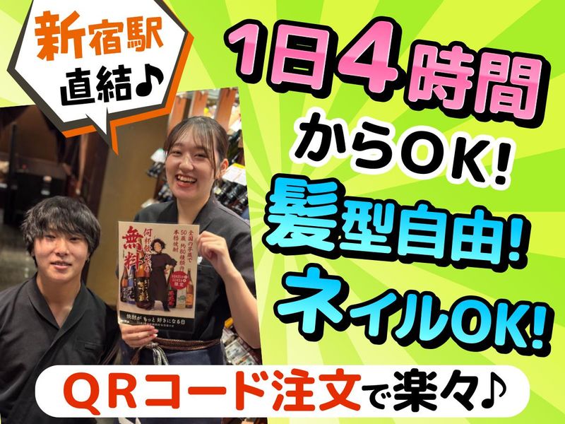 仕事内容 <<<<<<<<<<<<<<<<<<< ✨「新宿駅」西口から直結✨アクセス抜群✨ ✨自慢の絶品まかないは持ち帰りもOK✨ ✨おしゃれ自由✨ネイルも相談OK✨ <<<<<<<<<<<<<<<<<< 本格的な九州うまいもんと 希少銘柄を含む焼酎を気軽に楽しめる 居酒屋「芋蔵 新宿西口店」で 接客・ホールスタッフ募集! 【お仕事内容】 接客を中心に簡単な調理サポートもお任せ! 「まずは接客からしっかり覚えたい」 「ゆくゆくは料理も学びたい」 など、希望を考慮するので安心して下さいね✨ ✅ホール業務 ┗お席へのご案内 ┗料理やドリンクの提供、レジ対応 ※注文はQRコード&焼酎はセルフ式なので ミスなく接客に集中できます◎ ✅調理サポート(シンプルな内容が中心!) ┗簡単な盛り付けやサラダの準備 ┗慣れてきたら、揚げ物や焼き物にも挑戦! ※「少し興味がある」程度でOK! イチから丁寧に教えます。 -✄ ⏩フォロー体制バッチリ! 数年勤務しているベテランの フリーターさんも多い職場です。 困ったときは絶対にフォローするので、 飲食店が初めての方も安心して 飛び込んできてくださいね!