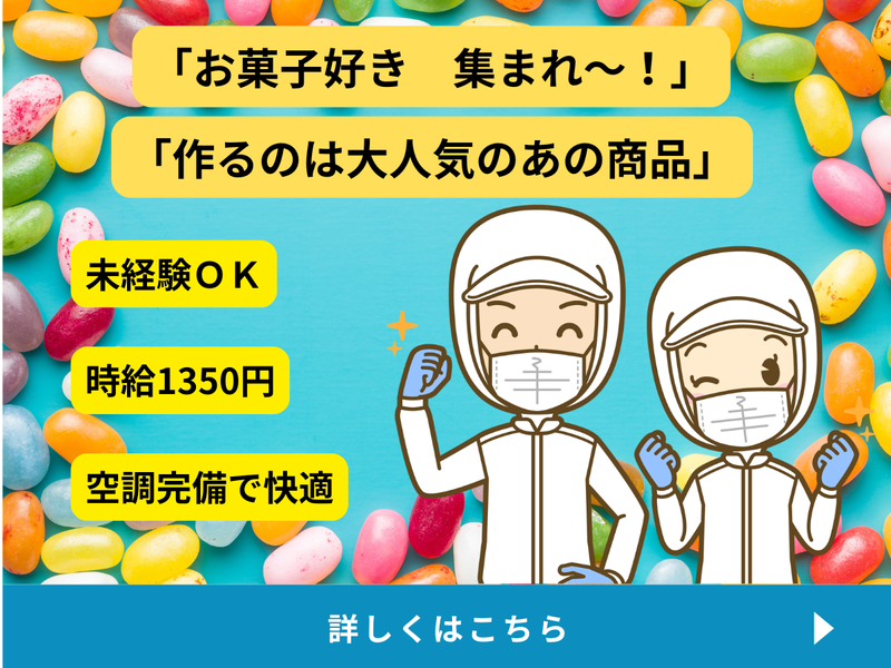 仕事内容 / みんな知ってる! あの有名お菓子を作るお仕事 \ ━━━━━━━━━━━━━━━━ ・。*大人気メーカーのお菓子作り*。・ ━━━━━━━━━━━━━━━━ キャンディー、チョコレート、ビスケット、 アイスクリームなどを作るお仕事です! 仕込み、成型、包装等をお任せします。 具体的には 原材料の取り扱いや 機械オペレーター・品質チェック、 商品のケース詰めの作業などです。 お菓子が好きな方大歓迎! イチから丁寧に教えるので 工場勤務が初めての方も安心して下さい。 【長期安定&安心の企業】 〇景気に左右されにくい ライフラインを支える食品製造のお仕事! *-*-*ここがポイント*-*-* ・長期安定で安心  ̄ ̄ ̄ ̄ ̄ ̄ ̄ ・有名&大人気のお菓子作り  ̄ ̄ ̄ ̄ ̄ ̄ ̄ ̄ ̄ ̄ ̄ ̄ ・絶品メニューの食堂は楽しみのひとつ  ̄ ̄ ̄ ̄ ̄ ̄ ̄ ̄ ̄ ̄ ̄ ̄ ̄ ̄ ̄ ̄ ̄ ・20、30代が活躍中!  ̄ ̄ ̄ ̄ ̄ ̄ ̄ ̄ ̄ ・未経験者積極採用中!  ̄ ̄ ̄ ̄ ̄ ̄ ̄ ̄ ̄ ̄ ・・・・・・・・・・・・・・・・・・・・・・・・・・・・・・・・・・・・・・・ 【株式会社サポートについて】 当社は人材派遣・アウトソーシング会社として関西から関東へと進出。 そして設立から30年目を迎えました。 当社の大きな特徴は 生活に根付く食品業界に特化してきたため 景況感に左右されず安定した 基盤があることです。 そういったノウハウがあることで 業務を広く請負うことができています。 今まで人材に関わる企業として たくさんの方をみてきた中だからこそ 地道にやってくれるスタッフの 有難さもわかりますし、その姿勢を しっかり評価していきたいと思っています。