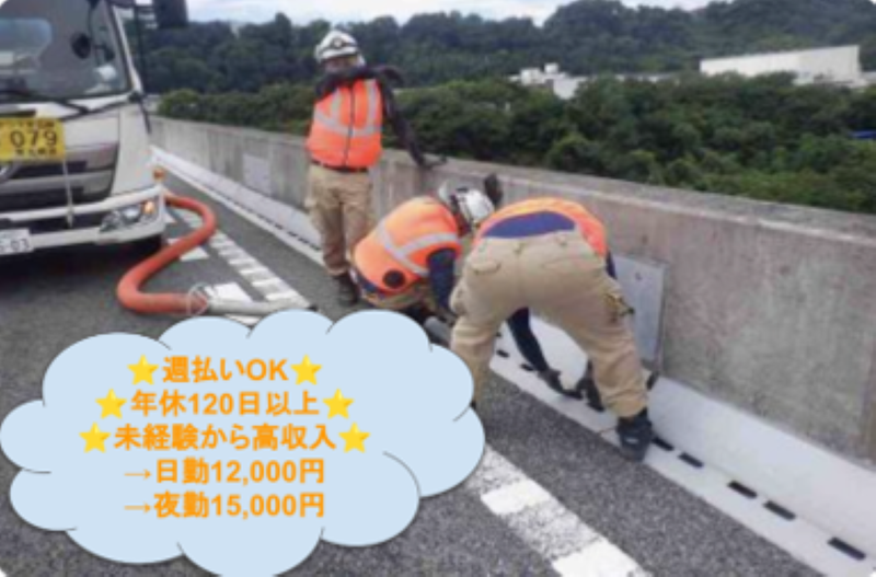 仕事内容 *✅未経験OK!人物重視採用です!* *✅未経験でも月給27万円~!* *✅マイカー通勤OK!無料駐車場あり* *✅地方から上京して働きたい方のために面接交通費支給* *✅高速道路は年間通して安定して働けるのが魅力!* *✅必須資格は普通自動車免許のみ!(大型免許、高所作業車の資格等お持ちの方は更に優遇!)* *✅海外出身の方も活躍中!* ※ビザのサポートありません。 —- *会社から季節に応じた寒さ/暑さ対策アイテムも準備!* **冬には** ・カイロ支給 ・防寒着支給 ・休憩室のストーブあり - **夏には** ・ネッククーラー ・スポーツドリンクの粉末+ウォータージャグ+氷セット ・熱中飴 ・クーラーボックスもあり! ・社内に大型冷凍庫もあり! ・空調服(規定あり) —- *【仕事内容】* 東名高速道路の利用者が「安全に」「快適に」走れるように! 交通インフラを支えるお仕事です。 高速道路上のメンテナンス作業をお願い致します。 一部、一般道もございます。 1班複数名体制でチームワークよく仕事をしています。一人ではないので、未経験の方にもスタートしやすい環境です。 現場作業での安全を第一に怪我や事故が起こらない体制を取っています。 <具体的な業務内容> 高速道路上に存在する構造物の補修や、排水管清掃・草刈り等を行います。 <取扱い機械> 高所作業車やバキューム車等 「スグ働きたい!」に応えられるスピード採用実践中! ご応募から業務開始最短でお仕事が始められるように取り組んでおります! *\先輩社員の50%は未経験スタート /* 今までのご経験は問いません。 1~3日間の社内研修をはじめ未経験からスタートいただく方のサポートは万全です。 20代、30代の若手の方が活躍中! 高速道路の仕事は、年間通して仕事があり安定収入が実現できます! *\道路舗装経験者Aさん、入社の理由は? /* Aさん(30代・元土木作業員) 道路工事に携わっておりましたが、 毎年3月からは道路工事閑散期に仕事量が少なく収入が減ってしまい 仕事を探していたところこちらの会社に出会いました。 入社して驚いたのは「高速道路の工事」は年間の仕事の変動が少なく安定していることです。 今まで収入の波がありましたが今は安定して稼げており転職してよかったです。 —- *【給与】* ①日給1万2000円<日勤> ②日給1万5000円<夜勤> *<収入例>* ①日勤1万2000円×16勤務=19万2000円 ②夜勤1万5000円×5勤務=7万5000円 ①+②+交通費5000円=27万2000円/月 月給:26万円〜33万円(研修期間満了後、手当支給!) ※大型免許持ち、高所作業車の資格持ちは優遇!(日給UP!) ※前払い制度あり(週払い) —- *【雇用形態】* 正社員 ※社内研修(8~20時間)あり *【会社概要】* 企業名 :アサヒエスティーシー株式会社 事業内容:建設業/警備業 所在地 :神奈川県横浜市緑区長津田町5673-1 従業員数:30人 会社URL:https://www.asahi-stc.com/
