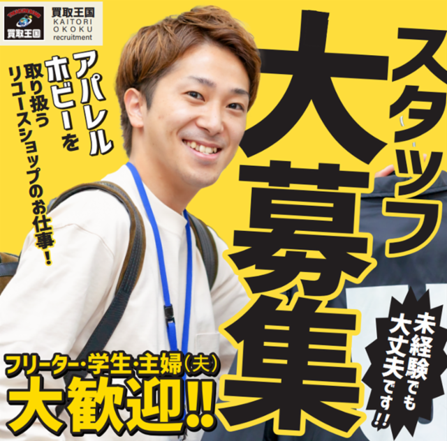 仕事情報 ● 仕事内容 買取王国良品買館は古着やブランド、フィギュアやトレカ、家電、家具、生活雑貨などを販売するリユースショップです。レジ対応などの販売接客や、商品の品出しや売り場づくりから始め、買取査定などのリユースならではのお仕事にもチャレンジ!商品知識だけでなく接客、査定など様々なスキルを得て成長できます! 未経験でも大歓迎です!! アルバイトが初めての方や、販売・接客経験がない方も大歓迎! 最初はトレーナーがついて1から仕事を教えていくので、安心し て始められます。また、各種マニュアルや、動画研修なども充実 しており、特別な知識やスキルがなくても、入社後1つずつ身に つけることが可能です。 頑張りに応じて時給UP◎ 買取王国良品買館ではキャリアパス制度を導入しています。 できる業務が増えれば増えるほど時給がUPする仕組みですので あなたの頑張りに応じて昇給していきます! 200円以上時給UPを達成したスタッフも 多数在籍していますよ♪ 働き方は人それぞれ 買取王国良品買館ではいろいろな働き方が叶えられます! お子さんのお迎えまでの短時間で効率よく働く主婦(夫)さんや 、学校が休みの日にガッツリ働く学生スタッフ、ライフスタイル に合わせて、趣味と仕事を両立しているフリータースタッフなど 、あなたにあった働き方を支援しています! 社割でおトクにお買い物♪ スタッフ割引は最大20%!!店内の商品をスタッフ限定価格で 買い物ができますよ◎欲しかったフィギュアや、好きなブランド 古着、バックやスニーカー、トレカ、キャンプ用品や雑貨、話題 の家電やスマホなど、欲しかったあの商品がお得に購入できます 。好きなものに囲まれて、楽しく働ける環境です!!