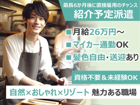 資格 \ 調理経験者優遇!ブランクOK / ◇調理経験を活かしたい方(ジャンル不問) ◇調理スキルを高めたい方(免許不要) ◇土日祝や繁忙期も働ける方 ◇チームワークを大切にできる方 以下のいずれかに当てはまる方はぜひご応募ください♪ *調理経験を活かして働きたい方 *ブランクがあるけどもう一度現場に戻りたい方 *未経験からキッチン業務に挑戦したい方 *自然の中でのびのび働きたい方 *イベントや限定メニューの開発に関わりたい方 *安定した環境で長く働きたい方