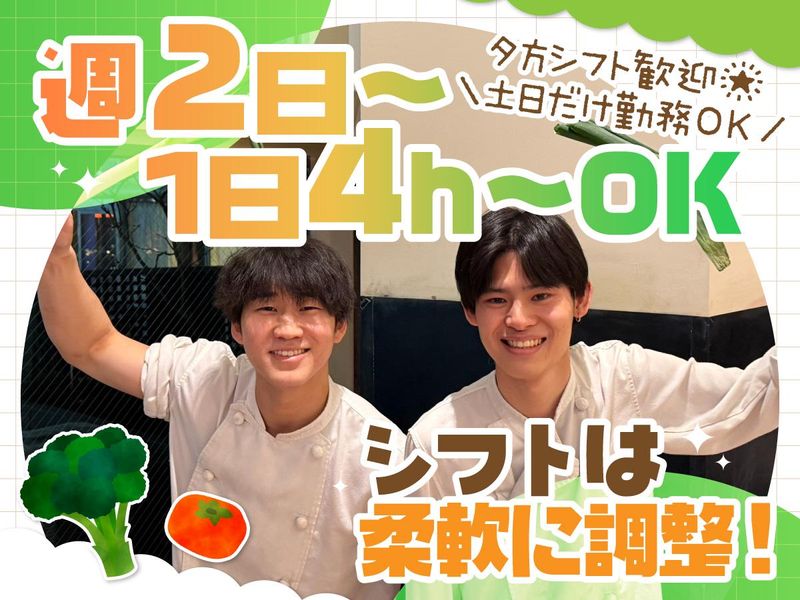 仕事内容 ✅おいしい野菜に出会える!? ✅野菜に興味がある方、大歓迎です! ✅学生・主婦さん活躍中! ✅美味しいまかない無料! 美味しい野菜・珍しい野菜が食べられる レストランでアルバイト・パート大募集! ホール業務では他のお店と比べると、仕事上のマニュアルはほとんどありません。それぞれがお客様を想い、行動しています。自由度が高く、あなたらしい接客ができますよ。 キッチン業務では、レシピがしっかりとあるので、料理をしたことがない方も始めやすいです。まずは簡単な盛付からお任せします! その他にも下ごしらえなどの業務もあります。慣れたら徐々にできることを増やしていきましょう!お料理スキルも身に付きますよ♪ <大事にしていること> 業務が幅広いので、やっていく中で 時には失敗することもあると思います。 失敗してもいいんです。 失敗することで学ぶことも多いですし、 失敗があるから、成功した時に嬉しさや達成感があると思っています。 学生さんは特に、失敗することの恐さや嬉しさを今のうちに学んでほしいです。スタートの時給は低いですが、成長する場面がたくさんあったり、経験値をつけるにはピッタリの環境です。 まずは、お互いに顔を合わせてお話しないとお互いにわからないと思いますので、お気軽にご応募いただき、面接でじっくりとお話ししましょう!働くメリットはもちろん、デメリットもしっかりとお伝えさせていただきます。 <他のお店では扱わない珍しい野菜が沢山> スタッフの皆さんは、野菜の知識を楽しく身に付けながら、それを自分の言葉でお客さんに伝えています!「仕事」を楽しく感じてもらえるようにみんなで一緒に店を作っていっていますよ♪ <職場の雰囲気・環境> アクセスは複数路線を使用可能なので、スタッフたちは色んな地域から通っています。 現在26名のスタッフが活躍中! 年代は10代、20代、30代、40代のスタッフが活躍しています。幅広い年代の方が活躍していますが、居酒屋のような賑やかさはなく、かといって静かすぎるわけでもなく、良い雰囲気の中で働けます♪人を喜ばせることが好きな方や野菜が好きな方が多いです。野菜に興味がある人は共感しながら楽しんで働けますよ! お子様のお休みやテスト期間など、休みやシフトはご相談ください。主婦パートさんも多数活躍しています。勤務時間も「この週はどうしても…」なども相談もお気軽にOKです♪ <こんな経験も活かせます!> 飲食店、カフェスタッフ、居酒屋スタッフ 調理補助、ホールスタッフ、喫茶店、接客業、飲食業などの経験をお持ちの方は経験を活かして働けますよ◎