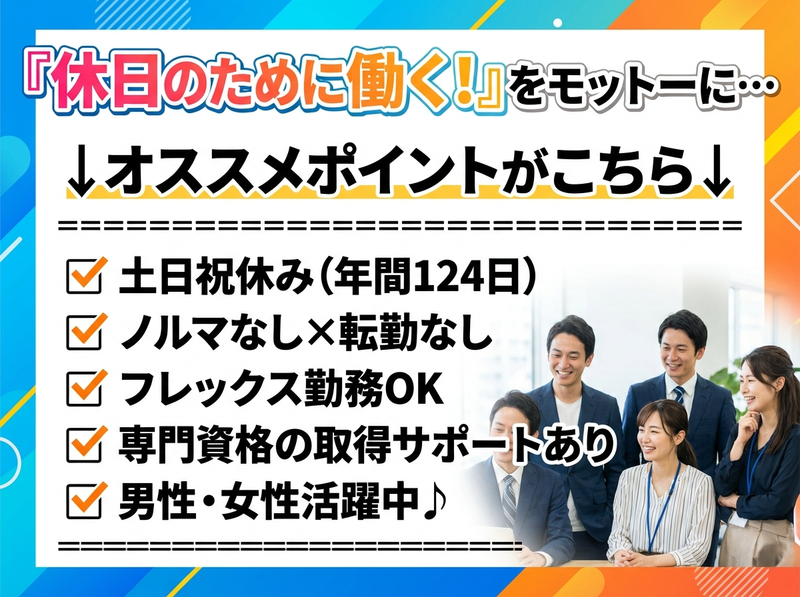 仕事内容 ┏━━━━━━━━━━━━━━━┓ ✨未経験OK!働きやすさ自信あり✨ ┗━━━━━━━━━━━━━━━┛ 『今度は私が求職者をサポートしたい!』 一度はそう感じたことはありませんか? この会社でその夢、叶えましょう! ================== ✅ 土日祝休み(年間124日) ✅ ノルマなし×転勤なし ✅ フレックス勤務OK ✅ 専門資格の取得サポートあり ✅ 男性・女性活躍中♪ ================== 【新着求人】 \ガツガツ営業ではありません◎/ 【既存フォロー(7割)】 ・企業への定期フォロー ・スタッフさんとの面談 ・就業初日の同行サポート 【新規(3割)】 ・問い合わせ対応 ・必要に応じたご提案 ⏩未経験でも大丈夫です! 独り立ちまでのサポートもバッチリ◎ <こんな方にピッタリなお仕事!>  ̄ ̄ ̄ ̄ ̄ ̄ ̄ ̄ ̄ ̄ ̄ ̄ ̄ ✅プライベートも大切にしたい! ┗土日祝休みで年間休日は124日✨ フレックス制度で時間の使い方自由自在! ✅キャリアアップも可能! ┗昇格・昇給のチャンスも!!! 努力がしっかり評価される環境です! ✅研修制度充実! ┗「OJT」「座学研修」「同行研修」など 未経験者向けの研修制度をご用意! 独り立ちは入社4ヶ月目以降だから 焦らず成長OK!! -