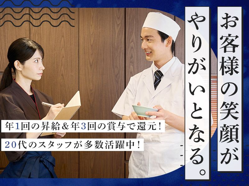 仕事内容 【和のおもてなしのプロへ】サービススキルを磨き、和の空間を提供するホールスタッフ募集 ↓↓ 求人のPOINTを要チェック ↓↓ *…*…*…*…*…*…*…*…*…* ✨実力次第でどんどんキャリアアップ可能! ✨賞与と昇給に加えてインセンで還元! ✨長期休暇や有給などお休みもしっかり! ✨まかないや健康診断など福利厚生が充実! *…*…*…*…*…*…*…*…*…* 仕事内容 : 「おもてなし」を通じてお客様に感動を提供する 〇開店準備・閉店作業 〇お客様の予約管理 〇お客様のご来店対応 〇接客・配膳・ドリンクメニュー作成 〇コースメニュー・ワイン等のご紹介 〇会計 など 【 教育制度 】 最初は基本的な業務からスタート。 慣れてきたら徐々に ステップアップしていきましょう。 【 キャリアアップ 】 実際に27歳で部長になった方も在籍しています。 年齢に関係なく、 実力がしっかり評価される環境です。 <こんな方を特に歓迎します!> ・「おもてなし」の精神を大切にし、お客様に感動を与える仕事がしたい方 ・実力で正当に評価されたいという向上心溢れる方
