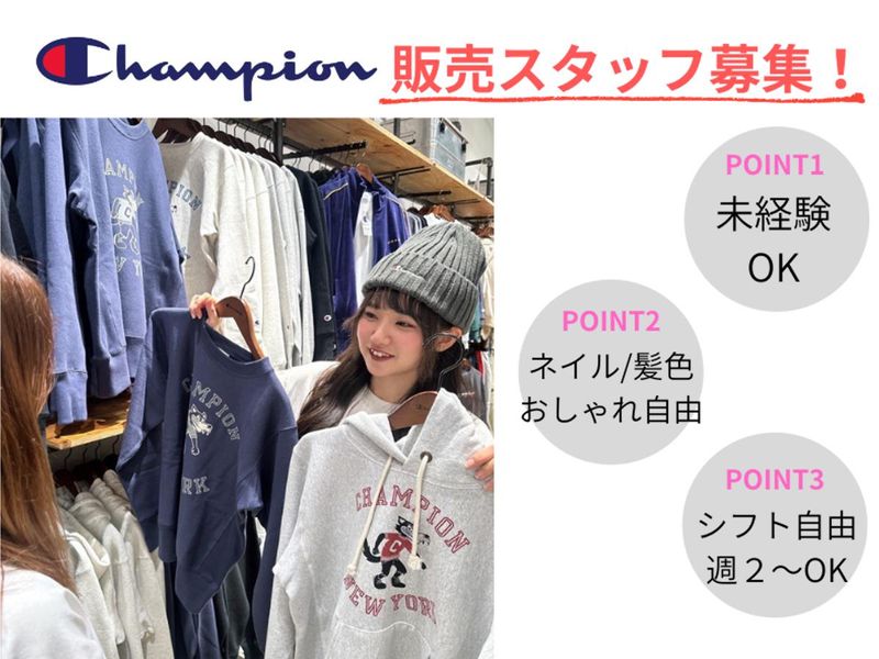 仕事内容 大人気ブランド 「Champion(チャンピオン)」にて 接客・販売業務を中心にお任せ♪ ≪具体的には…≫ ✅お客様へのご案内や商品説明 ✅レジ対応(会計など) ✅店内ディスプレイづくり ✅品出し・陳列・ストック整理 etc. ※ノルマは一切ナシ♪ _/_/_/_/_/ お仕事のPOINT _/_/_/_/_/ ✨勤務は即日スタートOK! ✨未経験からも活躍できる ✨ノルマなし・未経験スタートでも安心 ✨髪色・ネイル・ピアス自由(規定有) ✨社割ありでお得にGET ✨週2日~可>>プライベート充実◎ 【いらっしゃいませ!】が言えれば大丈夫★ 初バイトさんから、主婦さん・フリーターさん、 学生さんなど様々な方が活躍中☆彡