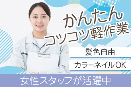 仕事内容 【おすすめPOINT☆】 ●働きやすい日勤!16時までの時短も相談OK ●力いらず♪部品同士をカチッとはめるだけ! ●空調◎の静かな職場!1人でコツコツ作業♪ ●髪色自由&カラーネイル◎おしゃれOKの職場 【お仕事内容☆】 電気部品を扱うかんたん軽作業をお任せします。 ▼具体的には… ◎小さな部品同士をはめ込む ◎製品にポンッと捺印 ◎傷や汚れがないかの目視チェック など、シンプルで覚えやすい作業ばかりです! 手のひらサイズの軽い部品なので、 力仕事はまったくナシ◎ 負担も少なく、毎日ムリなく続けられます♪ 作業は基本 ひとりでコツコツ進めるタイプ。 「集中して取り組むほうが好き!」という方にぴったり。 最初に丁寧に優しくレクチャーしてもらえるので 未経験の方も安心してスタートできますよ♪ 【職場について】 20代~50代まで幅広い年代の女性スタッフ在籍! 基本の勤務時間は、9:00~17:00 ですが、 16時までの時短勤務も相談OK♪ 「お迎えの時間が気になる…」 「家庭や育児と両立したい…」 そんな方も、どうぞお気軽に話してくださいね。 主婦さんや子育てママさんもたくさん活躍中! 無理なく自分のペースで働ける環境です。 髪色は好きなままでOK♪ ネイルカラーも楽しめます! 見えないところのタトゥーなら問題なし◎ さらに、 作業服のままラクラク通勤OK! 着替える手間なしで、朝もゆっくりできますよ♪ 【様々な方面からの通勤あり!】 福崎町周辺だけでなく、姫路市や市川町、 神河町、加西市、宍粟市などから通うスタッフもいます!