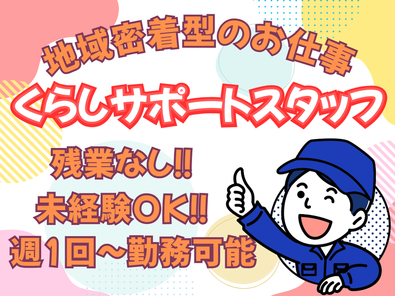 求めている人材 ✅要普通免許(AT限定可) ◆未経験・初心者OK ◆経験者・有資格者歓迎 ◆副業・WワークOK ◆学歴不問 ◆フリーター歓迎 ◆主婦・主夫歓迎 \ こんな方歓迎 / ▶人と接することが好きな方 ▶いろいろなことにチャレンジしたい方 ▶自分のアイデアや工夫を 活かして働きたい方 ▶経験を活かして活躍したい方 ▶チームで協力して仕事を進められる方 ▶人の役に立つ仕事がしたい方 ▶地域に貢献したい方