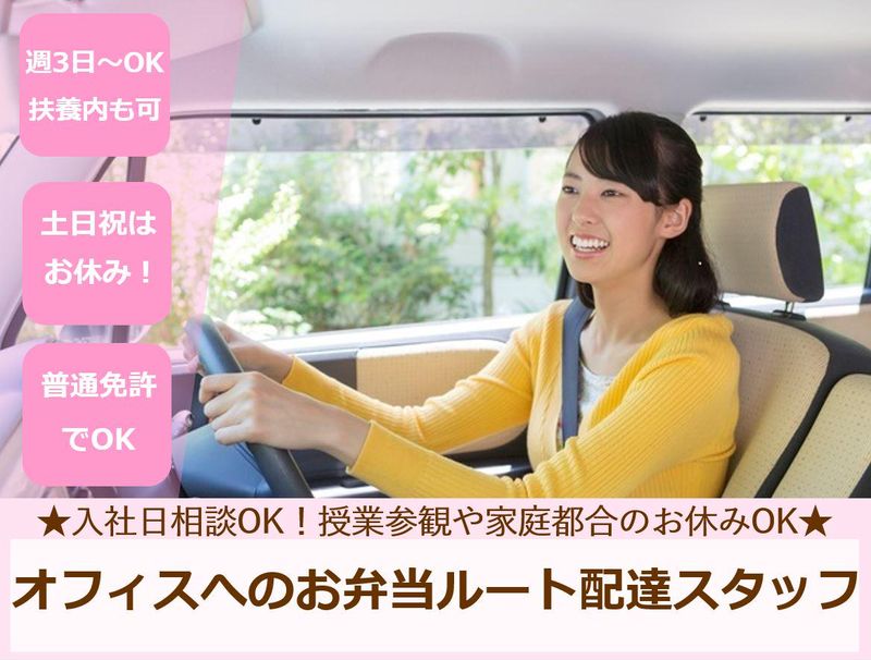 仕事内容 \女性活躍中◎主婦さんに優しい環境/ ✅週3日~OK▶週4日以上の勤務もOK ✅土日祝休み◎平日のみ勤務で家庭と両立 ✅家庭のお休み優先OK(授業参観など!) ★★★ココがオススメ★★★ ⭐慣れるまで先輩と一緒に配達で安心 ⭐お子様の夏休み終了後、即勤務開始したい方 ⭐扶養内勤務や日数・時間の相談も大歓迎 ◇お仕事内容◇  ̄ ̄ ̄ ̄ ̄ ̄ ̄ 軽バンでのお弁当の配達をお願いします。 ・荷物の積み込み ・配達先の確認 ・お弁当の配達 が主なお仕事になります。 1日30件程度の配達を、福岡市内の オフィスをメインにお願いします! 最初は先輩が一緒に回ってくれるので、 未経験・初心者の方も安心して始めれます◎ 先輩スタッフがしっかりサポート してくれるのでご安心下さいね♪ ◇主婦さんや20代~40代の女性活躍中◇  ̄ ̄ ̄ ̄ ̄ ̄ ̄ ̄ ̄ ̄ ̄ ̄ ̄ ̄ ̄ ̄ ̄ ̄ ̄ お子さんをお持ちの主婦さん多数活躍中♪ 授業参観でのお休みや、子どものための 急な体調不良でのお休みも相談OK! 入社日の相談も柔軟に受け付けます♪ 年明けからの勤務でも大丈夫ですよ◎ ご希望を教えて下さいね◎