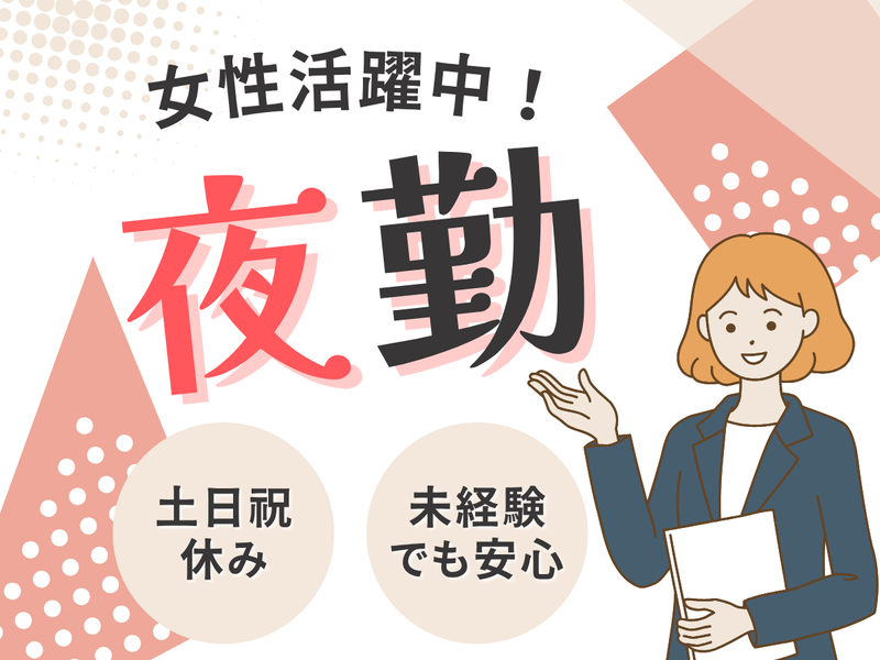 求めている人材 【こんな方にピッタリ】 ・静かな環境で集中して働きたい ・コツコツ同じ作業を続けるのが得意 ・夜の時間を使って効率よく働きたい ・久しぶりの仕事でも、 シンプルな作業からスタートしたい ・工場での仕事が初めてでも、 手順通りに覚えていける仕事を探している ・重たい作業は避けて、無理なく続けたい