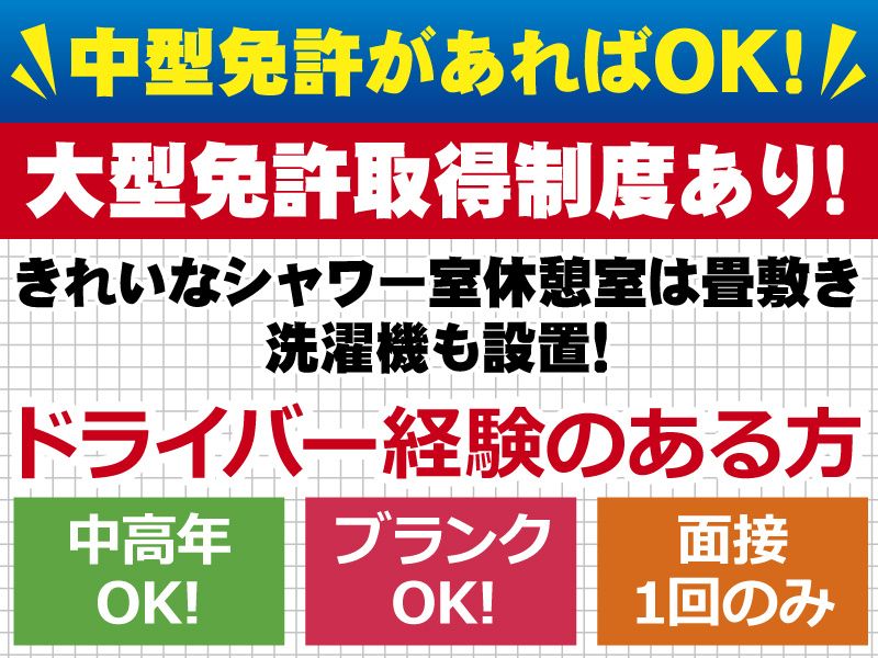 資格・経験 ドライバー経験者 中型自動車免許もしくは大型自動車免許 ※長距離運転の乗務経験のある方 4t中型長距離乗務経験があれば 大型免許取得支援致します。 取得費用は全額補助(当社規定あり) ※60歳未満(例外事由1号/60歳定年の為) 定年後、65歳までの再雇用制度もあります。