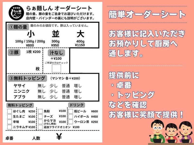 仕事内容 行列が止まない二郎系ラーメン店「らぁ麺しん」で ランチタイムのホールスタッフを積極採用中! (ディナー勤務もしたい方、大歓迎です!) ============= ✨働くおすすめポイント✨ ============= ✅週1日~OK◎ ✅シンプルなオーダー取り! ✅当月稼働分がすぐもらえる 月末締めの翌月5日支給! (振込or現金手渡し支給※日払い不可) ✅ラーメンのまかない有 ✅できることが増えればぐ~んと昇給! やりがいを感じれる、 長く楽しく働けるバイト・パート先を お探しの方にはと~~~~ってもオススメです! ――――――――――― お仕事を詳しく! ――――――――――― ・お客様を席へご案内 ・お水の提供 ・お客様からオーダーシートのお預かり、確認 ・キッチンへオーダーを通す ・料理の提供 ・レジ会計 ・外の待機列の整理 ・清掃 など お客さまが少ない時や手が空いているときに ・食材の仕込み(トッピング準備・盛り付けネギの補充等) ・簡単な調理 ・洗い物 などをおまかせ ✅お客様が記入したオーダー用紙を受け取って、 キッチンへ渡すだけなので簡単♪ ✅ホール中心になるので 明るく元気に接客をお願いします! ――――――――― お店について ――――――――― ■2018年にOPEN! カウンター9席+テーブル3つの全15席。 導線もシンプル! 各時間、店長とアルバイト・パートさん1名体制で 営業しています! 行列ができるお店なので忙しさはありますが その分あっという間に終業時間がキタ!ってなります(笑) ■水・小麦、接客スタイルにこだわりアリ。 「提供される水が美味しくて沢山飲んじゃう」 とお客様に言われるぐらい! 美味しさの秘密は、当店で働いたら知れますよ★ ■あなたの「働きたい」の気持ちを大切に 週1日~勤務時間数など相談します! 「週20時間以内で」「週末だけ」 「月8万円程、ここで稼ぎたい」など 教えてください◎ ――――――――――――― 働くスタッフについて ――――――――――――― ・30代主婦パートさん ・30代男性フリーターさん ・大学生さん など6名が在籍、活躍中です! 長い方で3年ほど続けてくれています♪