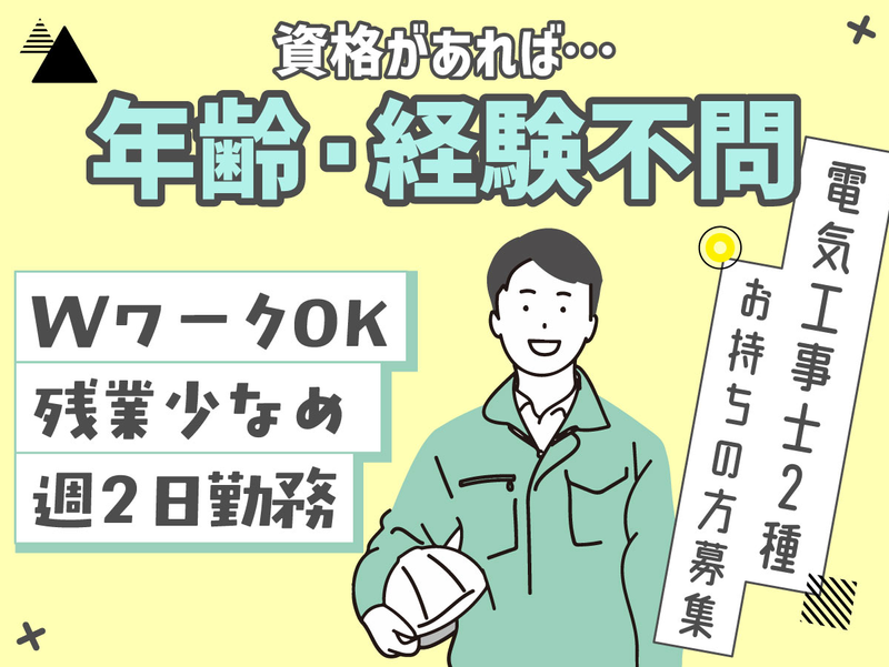 求めている人材 【必須】 第二種電気工事士の有資格者 学歴不問 年齢不問 性別不問 ★WワークOK! ★ブランクOK! ★シニア活躍中! <こんなあなたに> ・土日祝休みの仕事がいい ・適度に体を動かす仕事がしたい ・仕事とプライベートを両立させたい