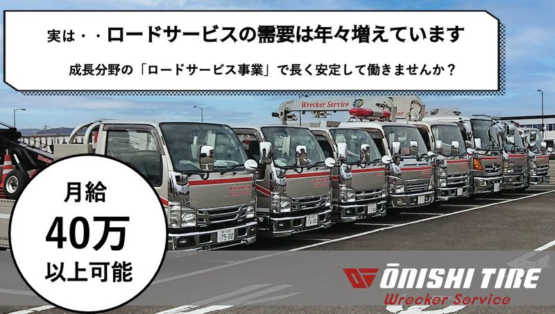 【仕事内容】 自動車トラブルの現場に出動し、小型~大型車両の応急作業などを行う自動車整備士(経験者)を募集します。 【オーニシタイヤのオススメポイント】 ・心からの感謝の言葉がもらえます ・納得感ある高収入も嬉しい環境です! ・人も車も助け出す、やりがい120%のお仕事 ■具体的な仕事内容 ロードサービスのスタッフとして、自動車トラブル現場での修理、対応、サポートをお願いします。整備の経験を活かして、確かな技術でお客様の安心を守ります。 ・バッテリー上がりの対応 ・タイヤのパンクの修理 ・ガス欠の給油作業 ・事故車や故障車をレッカー車などで移送 ・現場の二次的な事故防止で通行車両を誘導など 【安心研修で、一気にプロへのステップアップ】 業務未経験の方でも安心です。まずは先輩の車に同乗して、仕事の仕方や対応のコツなどを学んでいただきます。 その後、必要に応じて中型や大型免許、ウィンチやクレーン、玉掛などの資格取得の講習に参加し、どんどんレベルアップしていってください! ======================== 映画に登場するような、感動の仕事を ======================== 当社のレッカーサービスは、多くのお客様に寄り添い、まるでドラマの一場面のような感動シーンを数えきれないほど生み出してきました。 ある真冬のこごえる夜にバッテリーが上がり、車が動かなくなってしまったお客様がいました。すぐにレッカーサービスのドライバーが現場に到着、 「寒い中、大変でしたね。でも安心してください。すぐに解決させていただきます!」と笑顔で声を掛け、お客様にも安心していただきました。 別のお客様は水路にタイヤが落ちてしまい立ち往生。でも、レッカースタッフの笑顔と優しい言葉に安心感と勇気を得た、と語っておらました。 こうした心温まるエピソードや感謝の言葉は数知れません。お客様の笑顔や涙、感動や驚きを共有できるのが私たちの仕事の特徴です。 どんな状況でも冷静に行動し、お客様の車だけでなく心に寄り添い、ヒーローの様に人を救う仕事を、ぜひ一緒に体験してみませんか。 ========================= どこよりも働きやすい快適な職場環境! ========================= 給与やプライベートが充実してこそ仕事も頑張れる、それが私たちの考えです。 スタッフのワーク・ライフ・バランスを重視しており、さらなる働きやすい環境の整備に向け、全社をあげて取り組んでいます。 ・地域トップクラスの給与体系 ・週休2日制(月7~9日お休み) ・希望休日の相談可(全日OK) ・会社負担にて資格取得支援制度あり ====================== 転職者の声が語る、魅力あふれる職場! ====================== 「整備士時代より給与が上がりました!」 「本当に、本当に転職して良かった……」 「こんなに人に喜んで貰えるんですね」 など、喜びの声があふれる環境が自慢です。あなたが今まで培ってきた自動車整備士としての力や資格はここで活かされます。納得の転職してみませんか? 【求人ID-SBS】