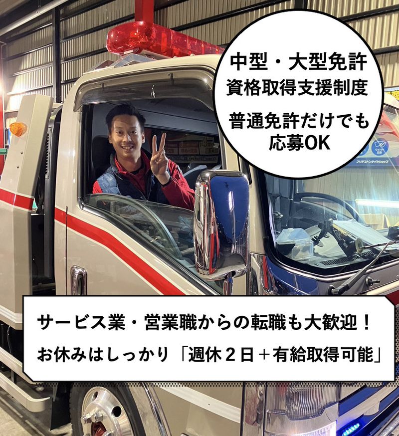 【応募資格】 【人びとの心に寄り添う仕事。】 私たちの仕事はお客様の心に寄り添う仕事。時には涙を流して喜ばれることも。レッカーサービスを通じて人びとを助けていきませんか。 ■必須条件 ・自動車整備士2級以上 ・整備士としての実務経験(年数不問) ・普通自動車免許または中型自動車免許 ※平成19年6月以降に、普通自動車免許を取得した方は中型免許が必要ですが、入社後、取得支援制度がありますので、お気軽にご応募ください。 ■優遇条件 ・大型自動車免許 ・玉掛け作業主任者資格 ・クレーン操作者の資格 【当社の想い】 自動車の整備・メンテナンスの技術・経験はもちろん必要ですが、当社が何より大切にしているのは「お人柄」です。 この仕事は本当に困っている人を助ける仕事です。人助けへの情熱を持ち、一緒に働く仲間を心から大事にできる人を採用したいと思っています。 【メリット】 #急募 #シフト自由 #新卒歓迎 #第二新卒歓迎 #未経験者歓迎 #経験者歓迎 #有資格者歓迎 #ブランクOK #学歴不問 #交通費支給 #社会保険完備 #資格取得支援あり #40代も応募可 #50代も応募可 #車通勤OK #バイク通勤OK #転勤なし #制服貸与 #昇給あり #賞与あり #残業なし