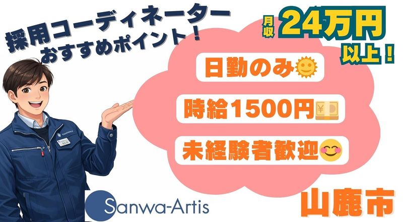 選考プロセス ―――ご登録について――― ① オンライン登録 スマホやタブレット、PCがあればいつでも登録ができます。 ※履歴書は不要です。 ② サンワアルティス事務所での面談登録 住所▶熊本県菊池市泗水町吉富205-4 ①または②のいずれかを選べます。 どちらも事前予約が必要となります。 ご希望は採用窓口までご連絡ください。 <採用窓口> TEL▶0120-880-889 【派遣元責任者より】 本日は数あるお仕事の中から、サンワアルティスの求人をお読みいただき、誠にありがとうございました。 お仕事条件はご希望に沿う内容でしたでしょうか。 また、わかりづらい表現などはございませんでしたでしょうか。 少しでも不安な点やご応募前に確認したい点などございましたらどうぞご遠慮なくお問い合わせください。 このお仕事(本求人では)は情熱あふれるコーディネーターが、あなたの専属担当としてご希望条件のヒアリング、職場見学、お仕事開始後のお悩み相談を責任もってご対応いたします。 最後になりますが、本日はご閲覧いただき誠にありがとうございました。 心より御礼申し上げます。 派遣元責任者 派遣事業部 次長 穴井 雄輔 080-8560-7040