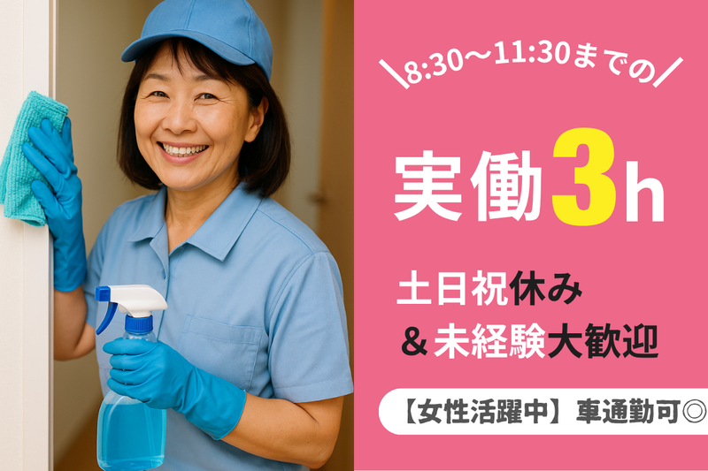 求めている人材 ……………………………………………… \✨ 未 経 験 大 歓 迎 ✨/ ……………………………………………… ■学歴不問 ■資格不問 ■主婦(夫)さん歓迎 ■ブランクのある方OK ■60代・70代のシニアも活躍中 むずかしい作業はないので 「お掃除の仕事が初めて…」 という方もスグに慣れて活躍できます! ~~~~~~~~~~~~~~~~~ ▼こんな方におすすめ ・身体を動かすことが好きな方 ・朝の短時間で稼ぎたい方 ・コツコツ作業が好きな方 ・他バイトとかけ持ちしたい方 ・扶養内でシフトが組みたい方 ・ハローワークでお仕事を探している方 ▼活かせるスキル アルバイト、パート、契約社員、 正社員などの雇用形態に関わらず マンション清掃や夜間清掃、洗浄、 マンション管理人、ベッドメイク、 ホテル客室清掃、ホテル清掃、 客室清掃スタッフ、施設清掃、 学校清掃、オフィスビル清掃、 病院清掃、住宅清掃、家事代行、 施設内清掃など清掃スタッフ・ 清掃員の経験がある方大歓迎です! (*必須ではありません。)