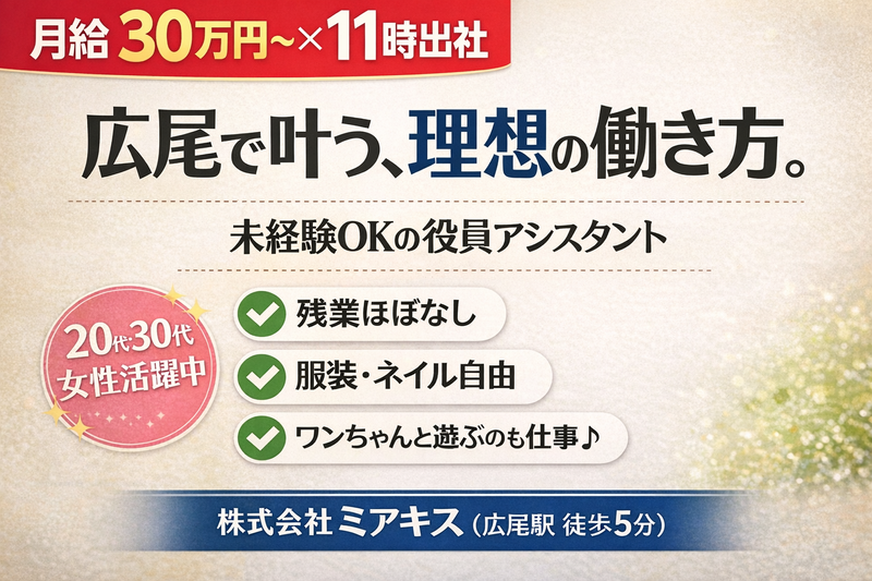 求めている人材 <必須条件> ・普通自動車運転免許(AT限定可) ・犬が苦手でない方(業務で関わるため) ・基本的なPC入力ができる方 ・数字や金額チェックに抵抗がない方 <歓迎条件> ・学歴不問 ・未経験OK(事務経験があれば尚可) ・第二新卒歓迎 ・ブランクあり歓迎 ・髪型、服装自由/ネイルOK ・経理補助の経験(弥生/freee/マネーフォワードなど) <このような方に最適です> ・気配りやサポート業務が得意で人の役に立ちたい ・スケジュール変更や急な依頼にも柔軟に対応できる ・コツコツした数字チェック・事務作業が好き ・外出とデスクワークのバランスが良い仕事がしたい ・犬と自然に触れ合える環境が好き ・社長、役員と近い距離で働くことに抵抗がない ・正確性や丁寧さを大切にできる ・広尾/恵比寿/六本木エリアの雰囲気が好き ・SNSやトレンドチェックが苦にならない <あれば活かせる経験> ・総務/庶務/バックオフィス経験 ・経理補助/請求書管理/入出金管理 ・役員サポート/秘書/セクレタリー ・アパレルやコスメなどブランド広報 ・PRアシスタント、ファッションプレス ・雑務や裏方仕事を丁寧に進める業務全般
