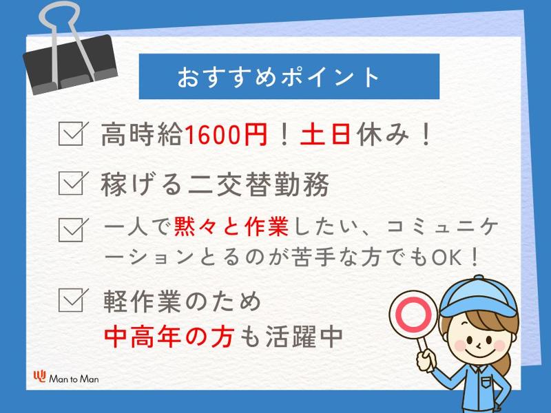 仕事内容: 【職種】 自動車のネジやボルトの目視検査 【仕事内容】 自動車のネジ、ボルトを製造している 工場でのお仕事です! ①小さな部品を機械にセット ②取り出して目視検査 これを繰り返すだけの カンタンな作業をお任せします! 一人で黙々と作業したい、 コミュニケーションとるのが 苦手な方でもOK! 教育期間もしっかりありますので、 未経験の方もすぐに活躍できます。 【オススメポイント】 ・軽作業のため中高年の方も活躍中! ・高時給1600円! ・先輩社員がフォローをしてくれるので未経験でも安心! ・就業前に工場を見学出来ます! ・即就業可能! ・オンライン面接も実施中! ・土曜面接開催中!