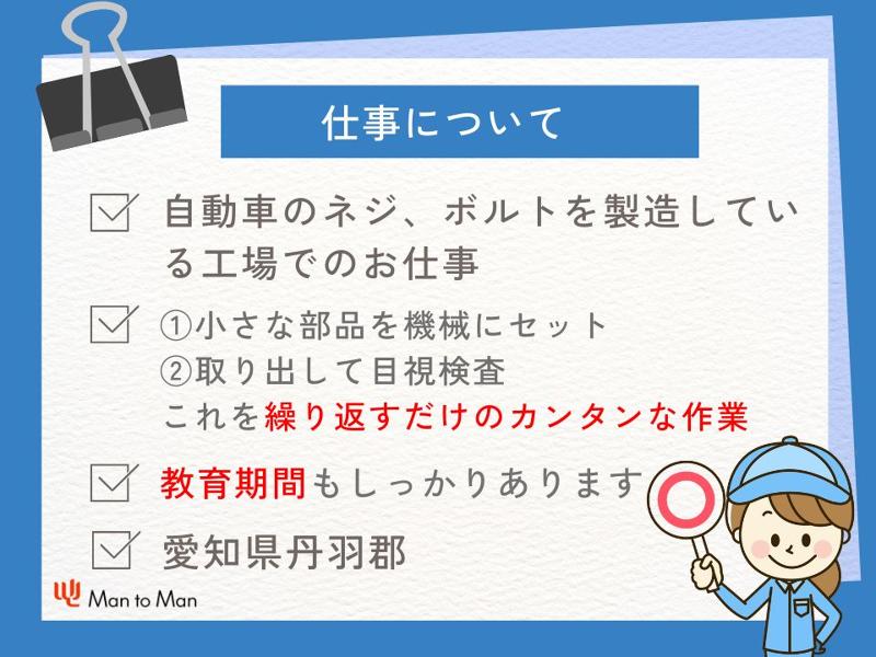 アピールポイント: 【2交替勤務/土日休み】自動車のネジやボルトの目視検査/ライン作業なし