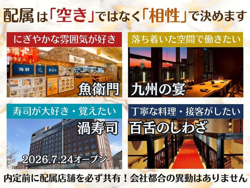 勤務地 配属候補は、 魚衛門/九州の宴/百舌のしわざ …すべて小倉駅徒歩8分圏内 渦寿司 …門司港駅から徒歩4分/2026年7月24日オープニング 通勤・生活動線がシンプルで、 北九州が初めての方でも働きやすい立地です。