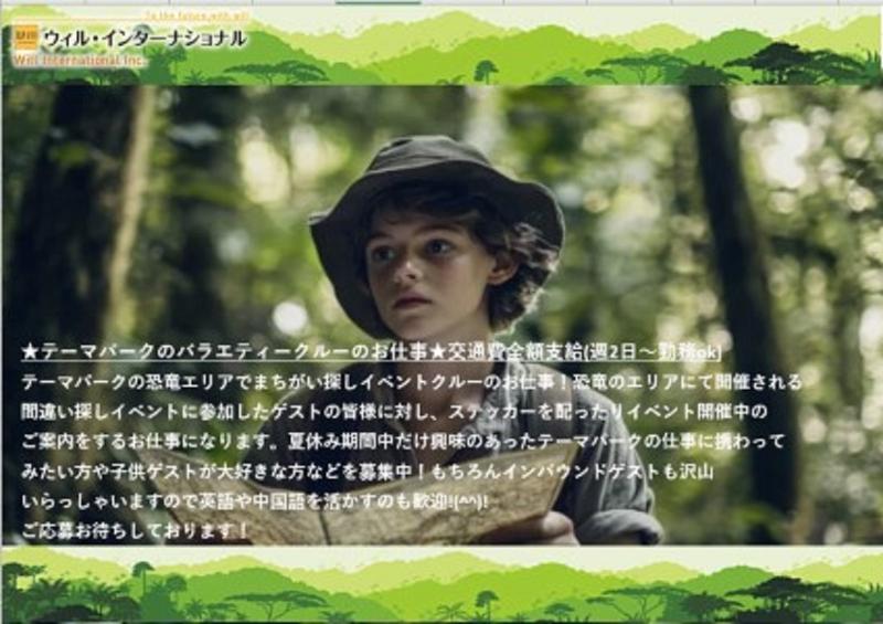 求める人材: ◇未経験大歓迎!年齢不問 ◇テーマパーククルーとして働く事に憧れのあった方や、 夏休み期間の短期を探していた方など大歓迎! ◇シフト遵守でご勤務頂ける方 ◇なにより楽しくお仕事をしたい方! 弊社の推進事業及びパートナー企業として 位置づけておりますテーマパーク事業のため、 一著しい勤怠不良や素行不良が目立つ方については クライアント様と関係性の悪化や、 ブランド力を毀損する可能性があるため、 ご勤務をご遠慮いただいております。 ------------------------------------------ 1つでも当てはまる方は是非、 ご応募ください(\^ω^\) 日本人スタッフ多数活躍中♪