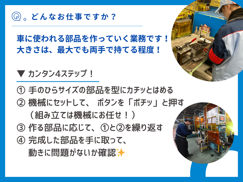 仕事内容 「接客業から、土日休みの仕事に転職したい」 「そろそろ安定した会社で、しっかりボーナスをもらいたい」 そんな20代の若手スタッフが多数活躍中! 未経験から大手グループの安定感を手に入れませんか? \当社の推しポイント!/ ⭐ 未経験活躍中! ⭐ 年間休日121日 ⭐ 土日休み(トヨタカレンダー) ⭐ 大型連休年3回あり(各平均9連休) ⭐ 賞与はなんと5ヶ月分! ⭐ 夜勤手当で効率よく稼げる! (手当だけで月約3万円UP✨) ⭐ 残業代は全額支給◎ ⭐ 安心の教育体制 ■ どんな仕事…? ┈┈┈┈┈┈┈┈┈•• 車に使われる部品を作っていく業務です! 大きさは、最大でも両手で持てる程度! ▼ カンタン4ステップ!  ̄ ̄ ̄ ̄ ̄ ̄ ̄ ̄ ̄ ̄ ̄ ̄ ① 手のひらサイズの部品を型にカチッとはめる ※いくつかパーツを組み合わせることもあります。 ② 機械にセットして、 ボタンを「ポチッ」と押す(組み立ては機械にお任せ!) ③ 作る部品に応じて、①と②を繰り返す ④ 完成した部品を手に取って、 動きに問題がないか確認✨ ※軍手を着用し、直接手で触って確かめます! ▼ 安心ポイント  ̄ ̄ ̄ ̄ ̄ ̄ ̄ ̄ ベルトコンベアで次々と部品が流れてくる 「ライン作業」ではありません! 一人ひとりの持ち場で作業を進めるので、 「自分が遅れたら後ろの人に迷惑が…」という心配は無用です。 ■ 未経験でも大丈夫…? ┈┈┈┈┈┈┈┈┈┈┈┈•• 「工場で働くのは初めて…」 「機械の操作なんてできるかな…」 そんな方もご安心ください! 手厚いサポート体制でお迎えします✨ ▼ 入社後のステップ  ̄ ̄ ̄ ̄ ̄ ̄ ̄ ̄ ̄ ̄ 【 現場でのマンツーマン指導!】 まずは先輩スタッフが隣について、 イチから丁寧にお教えします。 「見て覚えろ!」なんてことは 絶対にないので安心してくださいね◎ 【 定期的な面談でしっかりケア!】 入社後、1ヶ月・3ヶ月・6ヶ月・1年…と人事担当との面談があります。 「立ち仕事にまだ慣れなくて…」 「夜勤のコツってありますか?」 など、仕事の悩みからちょっとした相談まで、 スグに話せる環境を整えています! ▼ ゆくゆくは…?  ̄ ̄ ̄ ̄ ̄ ̄ ̄ ̄ ̄ 経験を積んで仕事に慣れてきたら、 将来はリーダー職や管理業務へのステップアップも可能! 活躍の場が広がることで、 もちろん ” 給与UP ” にも直結します✨ 半期に一度の評価制度があるため、 「コツコツ頑張っているのに評価されない…」なんてことはありません! あなたの頑張りは、賞与や昇給でしっかり還元します◎ ■ 千代田工業ってどんな会社…? ┈┈┈┈┈┈┈┈┈┈┈┈┈┈┈•• ズバリ!「 大手と取引多数の、超・安定企業 」です✨ 創業から70年以上。 自動車部品づくりにおいて、 物流から生産、最後の品質管理までを自社で一貫して行っています! ▼ 驚異の ”不備率ほぼ0%”!  ̄ ̄ ̄ ̄ ̄ ̄ ̄ ̄ ̄ ̄ ̄ ̄ ̄ ̄ すべての工程に責任を持つことで、 製品の不備率はなんと” ほぼ0% ”を誇っています✨ この確かな品質が、当社の最大の強みです! ▼ だから、業績の安定感はバツグン◎  ̄ ̄ ̄ ̄ ̄ ̄ ̄ ̄ ̄ ̄ ̄ ̄ ̄ ̄ ̄ ̄ ̄ ̄ 高い技術力が評価され、「トヨタグループ」をはじめとする 大手自動車メーカー様からたくさんの信頼を獲得! おかげさまで、業績は常に安定しています。 ▼ 安定しているから、社員へ還元!  ̄ ̄ ̄ ̄ ̄ ̄ ̄ ̄ ̄ ̄ ̄ ̄ ̄ ̄ ̄ ̄ ̄ 会社がしっかり利益を出しているからこそ、 「賞与5ヶ月分」や「土日休み・大型連休」など、 社員のみなさんが安心して働ける 充実の待遇をご用意できています✨