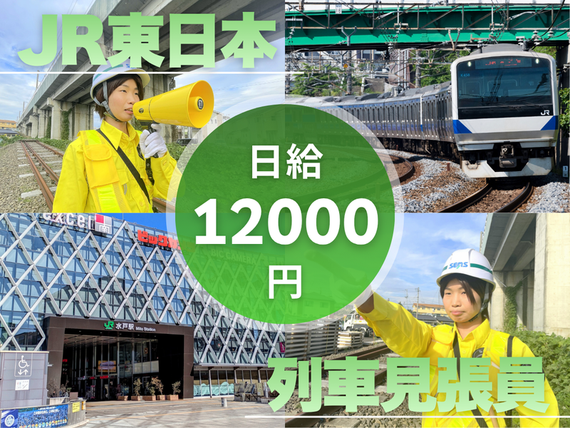 仕事内容 \JR東日本 水戸支社管内/ \での列車見張員募集!/ - 【具体的な仕事内容…】 <レア案件!!鉄道の列車見張り> 主に常磐線線・水郡線の鉄道現場で、 安全管理をし、現場で働く方々へ 運行情報や信号機を確認し、在来線 の接近状況を合図で伝えるお仕事です。 *・。.作業は旗を振るだけ.・。* 線路の横に立って電車の運行状況を確認し、 作業員に伝え、電車が来たら旗を振って 電車の運転手に安全を伝えるだけ♪ <監視の流れ> ◎運行ダイヤを見て電車が来るのを待機 ▼ ◎電車が来たら旗を上げる ▼ ◎仕事の基本はこの動き! ※「列車見張員」という資格が必要なお仕事になります (JRの講習受講で誰でも取得できます) ●やりがいを持って働けます! 電車が好きな方で、周辺の安全確認や誘導など、気配り・目配りができればきっと楽しく働ける環境です。 ●日給1万2000円…しっかり稼げます! 月23日程度の勤務で、月収は27万6000円程度となります。社会保険加入、交通費も別途支給します。基本土日休みなので、プライベートの時間もしっかり取れるのがこの仕事の魅力です! ●他業種からの転職実績多数! 工場、清掃、運送、建設、サービス業、接客販売、営業など様々な業種からこの仕事に転職した先輩がたくさんいます。 ※「列車見張員」の資格取得までは一般の交通誘導のお仕事をしていただきます。(日給12000円/入社3ヶ月間)