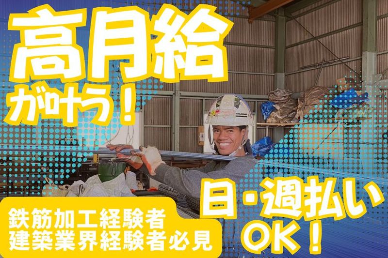 【アピールポイント】 ※鉄筋加工経験者もしくは建築業界経験者必見※ 【鉄筋加工の経験を活かして働きませんか?】 ✅寮完備 ✅資格取得支援あり ✅残業なし ✅賞与あり ✅日払い・週払いOK ✅長期休暇もあり ぜひご応募お待ちしております!