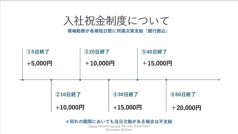 アピールポイント: 現在警備STAFF数は 6名(女性2名、男性4名)。事業拡大により、新規STAFFを募集します。 事務所には駐車場があるので、マイカーでの出勤も大丈夫です。日々のお仕事は各現場へ直行直帰なので、現場が15時など早めに終わった日は、そのままご帰宅いただいてい大丈夫です!もちろんお給料は日給12,000円が支給されます。 職場は落ち着いた雰囲気でサポート体制も万全。 業界未経験やブランクのある方でもしっかりフォローしていきますので、安心して就業できます。(過去実績あり) 入社祝金最大7.5万円支給 現場勤務5日終了時5,000円 10日終了時10,000円 20日終了時10,000円 30日終了時15,000円 40日終了時15,000円 50日終了時20,000円 リフレッシュ支援金50,000円支給 入社後1年経過ごとに、ゆっくり休んもらうためにささやかですが50,000円を支給させてもらっています!少し豪華な食事や、旅行代の足しに活用してください! * 完全週休2日制(土日祝日休み) * 6ヵ月経過で有給休暇付与(10日) * OJT研修あり
