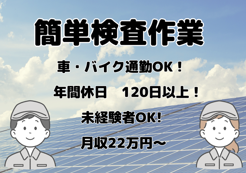 仕事内容 太陽光パネルの製造並びに検査業務 その他求人もたくさんあります <登録だけでもOK>姫路・たつの・高砂 その他、色々な勤務地がありますので、 気軽にお問い合わせください。出張登録OK!!