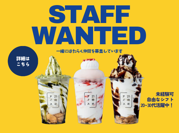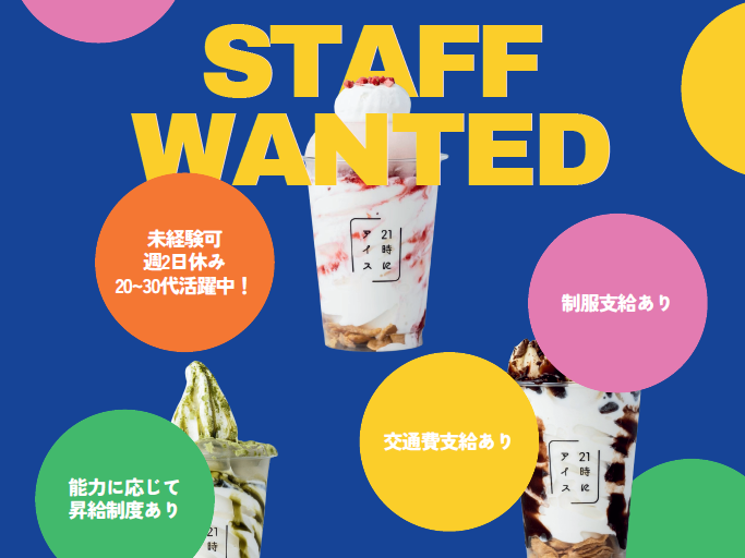 仕事内容 ✨ SNSでも話題の夜アイス屋さん ✨ ――――――――――――――――――― *午後からの勤務!週休2日制で安定♪ *店長へのステップアップも目指せます◎ *ネイルOK♪自由にオシャレを楽しめます ――――――――――――――――――― 【 仕事内容 】 アイスの販売・接客・調理全般と 発注管理、スタッフ指導など、 アイス店の店舗業務をおまかせします。 ●具体的には… *オーダー確認 *お会計 *アイスの盛り付け *在庫管理 *機材や調理台の清掃 *業務日報 *アルバイトの衛生チェック *SNSの更新 など ★業務については最初に丁寧にお教えします! 未経験の方も大歓迎♪ ★基本的に1〜3人体制での店舗です。 ★困ったことは本社スタッフにすぐ相談できます! 24時間いつでも連絡可能です! ✨ 努力や結果をしっかり評価! ✨ ――――――――――――――――――― 「売上目標」「季節メニューの販売実績」 「売上成績MVP」「口コミ件数」など… 評価の場面が多数◎ 成績に応じてお祝い&評価します♪ ――――――――――――――――――― ✨ キャリアアップも目指せる! ✨ ――――――――――――――――――― ゆくゆくは販売スタッフとしてだけでなく、 店舗運営にも携わっていきたい…! 入社すぐ店長もOK! あなたのスキル&コミュ力を活かして 売上&顧客満足度UPに繋げてください♪ ――――――――――――――――――― ✨ 『21時にアイス』について ✨ ――――――――――――――――――― 「夜の時間に小さなご褒美と癒しを」 味はもちろんのこと、見た目にもこだわった アイスをお届け♪ SNSでも好評を博したお店の正社員募集! 自分らしく働きたい方を応援します! HPも是非ご覧ください! https://21-ni-ice.com/