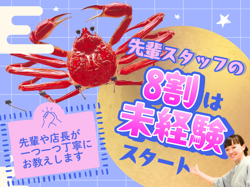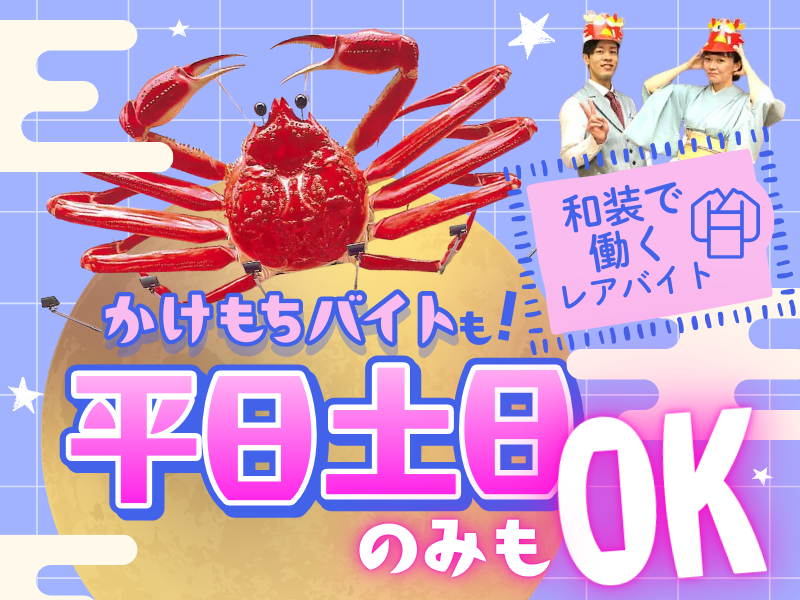仕事内容 ディナータイムに働ける方大募集 ✅かに道楽で働くポイント! ―――――――――――――――――― ⭐人と話すことが好きな方は歓迎! ホール・接客未経験OK ⭐和装で働けるレア求人♪ 美しい所作が身につきますよ! ⭐週2日~OK!プライベートと両立◎ 無理のないシフトで、一生モノのスキルが身につきます ✅お仕事内容 ―――――――――――――――――― ・テーブルセッティング ・お客様をお席にご案内 ・ドリンクづくり ・オーダー取り ・コース料理配膳 など ホールはホールでちゃんと分業しているので、 料理やレジ対応などはございません! あなただからできる接客を目指せます◎ 1日当たり35名のスタッフが働いています。 新人さんには必ず社員スタッフがつくので、 未経験でも安心です◎ ✅入社後の流れ ―――――――――――――――――― まずは、先輩や店長がついて 業務を一つ一つ丁寧にお教えします。 最初は「団体席」などの開けた席から! 先輩がそばについているので、 安心して覚えていただけますよ◎ 徐々に個室接客もお願いしていきます! 🦀和装について ―――――――――――――――――― ✊最初は二部式着物からスタート! 上下別れた簡易着物なので、 慣れれば15分ほどで自分で着付けできますよ◎ (最初は30分ほどかかります) ✊着付けや立ち振る舞いなどは、 社員スタッフが丁寧にお教えします! ✅Q&A ―――――――――――――――――― Q.「アルバイト経験がないのですが…」 A.「大丈夫です!先輩スタッフの8割は全くの未経験スタート! 最初はかんたんな配膳から始めて、 徐々にオーダー取りなどお教えします◎ 社員やベテランスタッフがマンツーマンでお教えするので 安心してスタートできる環境です!」 ✅スタッフインタビュー ―――――――――――――――――― 着物を着ている時の所作や歩き方、 言葉遣いに至るまで、 一つひとつ丁寧に教えてもらえます。 「こういう時はこう伝えると良いんだ」 という学びになり、毎日が発見の繰り返し! 新鮮だなと感じています。 「バイトを始めて変わったんじゃない?」 と親から言われることも…♪ 仕事を通じて自分の成長を実感しています。 (23歳女性 フリーター)
