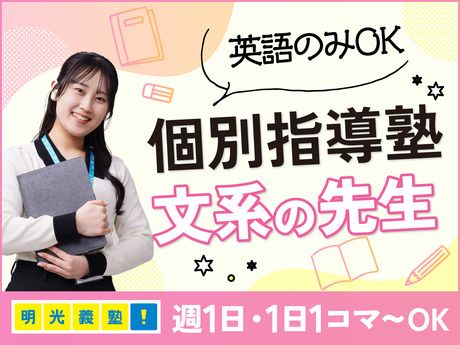 仕事内容 具体的には 1対3の個別指導で、やさしく生徒をサポートします。 「一科目だけ」「得意科目から教えてみたい」など、 まずはご希望をお伺いします。 授業の流れ▼ ・生徒さんと楽しくお話してスタート ・前回の復習でおさらい ・問題を解きながら「ここがわからない」を解決 ・授業が終わったら記録をタブレットに入力 未経験でも安心してスタートできる研修制度が整っています! 塾講師になるまでの流れ 【応募】 ▼ 【面接】 ▼ 【学力&適性検査】 ▼ 【採用!】 まずは研修映像を見て基本を学ぶ新人講師研修を。 その後、授業見学やロールプレイングなど明光義塾ならではの充実した研修を実施。 未経験の方でも自信を持って明光義塾の講師としてデビューできるよう、 しっかりサポートします! 指導科目 国語、社会、英語、 古典、小論文、現代文、 日本史、世界史、地学科目などから、 指導可能な科目をお任せします。 ご希望があれば、文系以外の授業も担当可能です。 まずは「文系科目だけ」「英語だったら…」など、 できるところから始められます。 職場の環境について 20代を中心に、大学生から主婦(夫)の方まで幅広い世代が活躍中! なんと8割以上が未経験からスタートしています。 <こんな方、大歓迎です> 生徒さんの成長を見守りたい やさしく教えることが好き 将来、役に立つスキルを身につけたい 嬉しいポイント ■就活に強い 教える力や伝える力はどんな仕事でも評価されるスキル。 面接でも堂々とアピールできます! 就職活動支援のカリキュラムあり♪ 就活の役に立った!という卒業生も多数います。 ■プライベートにも役立つ 最新の教育情報に触れられるので、お子さんの受験や学習サポートにも活かせます。 ■保護者対応は不要 生徒さんのおうちの方とのやり取りは、社員が対応するので安心です。
