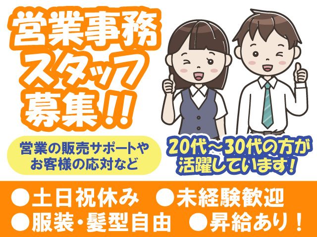 仕事内容 【事業拡大のため販売スタッフを増員】 土日祝休みの営業事務スタッフを募集します! 国内最大級の大型冷風機の提案及び販売や レンタルのご案内をするお仕事をお任せします。 販売スタッフとして電話業務が中心です。 完全未経験でも一から丁寧に指導します! 募集職種 営業事務スタッフ(未経験歓迎) 雇用形態 正社員 <主な業務> 法人のお客様に対しての自社製品の販売スタッフを募集中! 弊社製品の案内・販売やレンタルの手配、企業様からのお問合せ対応や営業のサポート業務などになります。 主にこちらからお客様へ連絡することも多いので 一般的な事務業務とは多少異なりますが商品知識や営業スキルが身につきます! 今回は完全未経験でも歓迎です! 一から丁寧に指導してキャリア育成をいたします 【こんな方にオススメ】 〇未経験でも、人と話すことが好きな方 〇35歳まで(省令三号のイ) 〇昇給・賞与があって長期的に腹きたい方 〇これまでに正社員またはパートで 「サービス業」または、 「一般事務」や「営業事務」をしていた方 〇家事と仕事も両立させたい主婦(夫)さん 〇現在パートで働いていてこの機会に正社員になりたい方 〇「座って仕事がしたい」「パソコンを使った業務もしたい」という方 〇リゾートマンション最上階(14階)宿泊費無料で使えます! (大浴場、露天風呂、室内プール、ジャグジー、コインランドリー、レストランなど利用可能) スキー場が近くにありご家族やお友達と一緒にご利用ください! 6名ほどまで宿泊可能な施設となっております 【当社事務職のポイント】 <20代~30代の正社員が活躍中> 当社事務の仕事は事務ワークが中心です。 座り業務で体の負担なく働けるので、 子育て中の主婦(夫)さんも安心です。 土日祝休みでお休みもバッチリ! 年間休日120日! <事務の未経験者も歓迎> 3か月の試用期間もありますが急ぎません。 サポートするので1年位かけゆっくり独り立ちしてください! 基本的に、2名1チームでお仕事を進めていただくため安心してください◎ <先輩スタッフのコメント> 時には他の事務さんや営業さんとくだらない話をしたり、真剣な意見交換をしたり・・・。 和気あいあいとした環境ながらも、メリハリのある働き方が出来るところが気に入っています! 同じように感じ一緒に成長しあえる仲間を募集中です! <服装> オフィスカジュアル ネイル・髪型自由 <通いやすい立地> 御成街道沿いで杉戸町内の方はもちろん、 近隣の春日部市、宮代町、久喜市、幸手市、 白岡市、蓮田市などから通うスタッフも多数。 ※車・バイク・自転車通勤可能 (敷地内に駐車場完備) 経験・未経験問いません! 転職を検討している方、 ぜひ当社販売スタッフとして活躍してください! お仕事に関するご質問や詳細確認など、 以下へお気軽にお問い合わせください。 TEL 0480-33-3989(採用係)