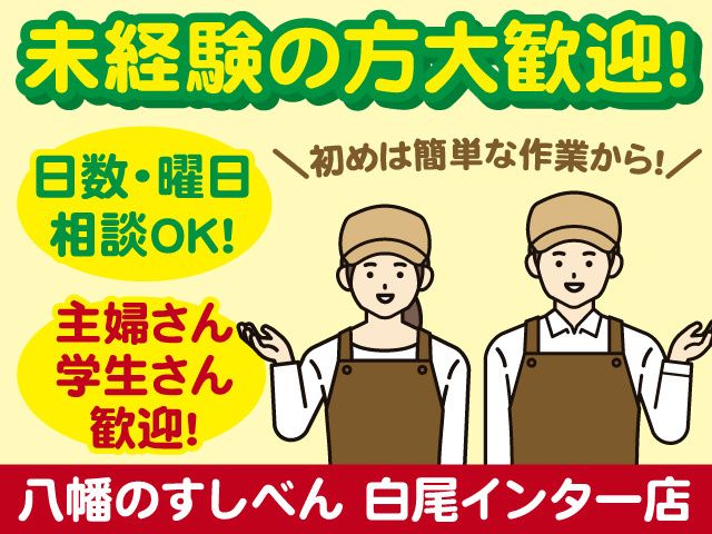 仕事内容 「八幡のすしべん 白尾インター店」 パート・アルバイトさんを募集中 7時半~22時の間で勤務時間ご相談OK! 早朝・夕勤の時間帯急募! 勤務日数・曜日など、 あなたの希望の働き方をご相談ください。 【すしべんで働く魅力をご紹介】 ━V━━━━━━━━━━━━━━ ▶シンプルで簡単な作業がメイン ▶希望に応じて勤務日数や曜日を調整可能 平日のみOK・土日祝のみもOK! ▶食事補助制度あり ▶規定に基づき交通費を支給 ▶Wワーク・副業OK ━━━━━━━━━━━━━━━━ 【主なお仕事内容】 〇お客様のお席へのご案内 〇食器の片付け 〇レジ接客 〇かんたんな調理補助や配膳 〇お弁当・お惣菜コーナーへの品出し陳列 などのお仕事をお願いします。 ※難しい作業はありませんのでご安心ください <未経験・ブランクの方も安心の環境> 初歩的なことから研修を行い、 簡単な作業からスタートしていただきます。 飲食店勤務が初めての方、調理経験がない方、 接客が初めての方、初バイトの方、 久しぶりのパート復帰の方もご安心ください。 分からない事はしっかりフォローします! <ライフスタイルに合わせて働けます> 20歳代、30歳代、40歳代、50歳代の方 主婦(夫)さん、学生さん(大学生・短大生・専門生) フリーターさん、Wワークさん 男女で様々な方が活躍しています。 「平日のみ」や「土日祝のみ」 「平日と土日祝の組み合わせ」など 日数ご相談いただけますので 安定して収入を得たい方にもオススメです! 一緒に楽しく働きませんか? スタッフ同士の仲が良く、 和気あいあいとした雰囲気が魅力です。 初めての方もすぐに馴染める環境なので、 安心してご応募ください! ご連絡お待ちしております。