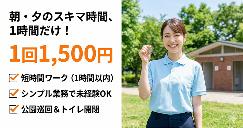 仕事内容 【ここがポイント!】 ✅ 1回1時間以内の短時間ワークで無理なく働ける ✅ 朝・夕のスキマ時間を有効活用できる ✅ シンプル業務で未経験でも安心スタート ✅ 体への負担が少なく長く続けやすい ✅ 1回1,500円(交通費込み)で効率よく収入確保 【仕事内容】 横浜市内の公園にて、トイレの鍵の開閉と簡単な巡回業務をお任せします。 決まった時間に訪問し、ルーティン作業を行うシンプルなお仕事です。 <主な業務> ・公園内トイレの開錠・施錠 ・トイレ周辺の簡単な巡回確認 ・異常や破損の有無チェック ・不審物や危険箇所の確認 ・利用状況の簡単な確認 ・必要に応じた報告業務 【1日の流れ】 ・指定時間に現地へ直行 ・トイレの開錠または施錠作業 ・周辺の簡単な巡回・確認 ・異常がないかチェック ・必要事項を報告 ・業務終了後はそのまま直帰 【入社後の流れ】 最初は作業手順や巡回ルートについて丁寧にレクチャーします。 業務内容はシンプルなため、未経験の方でもすぐに慣れていただけます。