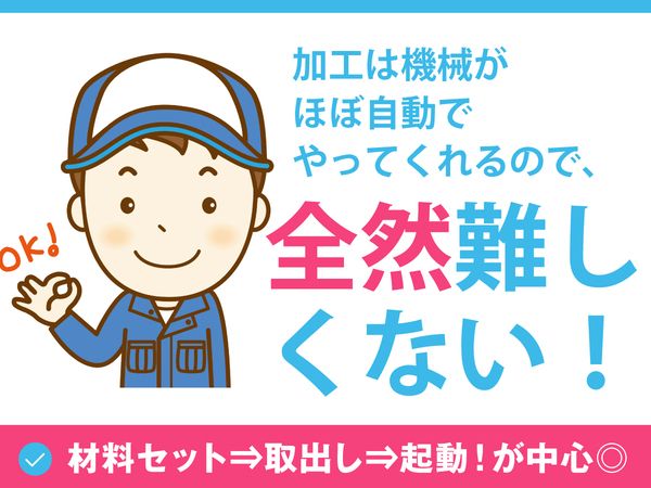 仕事内容 西白河郡泉崎村大山にある工場でのお仕事になります 【お仕事内容】 金属製の材料を機械を使用して加工する業務を担当していただきます。 加工は機械が自動でおこなうので、 材料のセット・取出し・起動が仕事のメインとなります。 仕上がり品の検査や測定等の作業もございます。