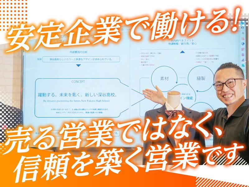 仕事内容 \制服を通じて、“学校の思い出”を支える営業/ ✨ノルマなし・残業ほぼなし ✨新規開拓なし/既存顧客中心 ✨安定した需要のある“学校制服”を扱う 創業86年の安定企業で、 お客様との信頼関係をじっくり育む仕事です。 新規開拓は別部署が行うため、 既にお取引のあるお客様との 関係性を深めることがメイン! お客様のお困りごとを解決する ”パートナー”としてご活躍いただける、 制服のルート営業職です。 制服のデザイン・素材・価格など、 会話の中から潜在的なお困りごとを拾い、 ピッタリの解決策を提案する――。 “売る営業”ではなく、“信頼を築く営業”として、 腰を据えてご活躍いただける環境です。 - 【具体的には】 ■既存顧客の訪問  ̄ ̄ ̄ ̄ ̄ ̄ ̄ ̄ ̄ 既に取引経験のある販売店先へ お悩みごとがないか定期訪問します。 ■お悩みへの提案・サポート  ̄ ̄ ̄ ̄ ̄ ̄ ̄ ̄ ̄ ̄ ̄ ̄ ̄ ̄ 「新しい制服を作りたい」 「制服のサイズの幅を広げたい」など 色んな悩みに寄り添い、解決策を提案! ■販売代理店との交渉  ̄ ̄ ̄ ̄ ̄ ̄ ̄ ̄ ̄ ̄ 学校から発注を頂けた際に、 当社製品の導入について交渉します。 場合によって、新しい販売代理店様と 新規取引を行う場合もあります。 基本的にどの販売店様も、 単価の高い商品を扱っているため丁寧な対応です。 - *経験を活かしながら学べる環境*  ̄ ̄ ̄ ̄ ̄ ̄ ̄ ̄ ̄ ̄ ̄ ̄ ̄ ̄ ̄ ̄ 入社後は、先輩や上司に同行しながら 業界知識や仕事の流れを 少しずつ学んでいただきます。 これまでの営業経験を活かしながら、 業界知識は入社後にしっかり身につけられます。 すぐそばに上司や仲間がいるので、 「ちょっと聞きたい」がその場で解決できる距離感。 会社全体としての目標はありますが 数字に追われるようなきついノルマもなく、 無理なくじっくり取り組める環境です。 社歴や年齢に関係なく意見交換ができ、 他業界から転職してきた営業経験者も 多数活躍しています。 *メリハリある働き方ができます*  ̄ ̄ ̄ ̄ ̄ ̄ ̄ ̄ ̄ ̄ ̄ ̄ ̄ ̄ ̄ ̄ 6月~11月は閑散期となるため、 スケジュールは基本的に自分で調整可能。 残業も全くないので、商談の準備や資料作成など 提案の質を高める時間にあてられます。 一方で、繁忙期でも1日の残業は 長くても1時間程度。 無理のないスケジュールで、 お客様一人ひとりに丁寧に向き合える環境です。 単に商品を売るのではなく、 大切なのはお客様との関係構築と課題解決。 接客や販売で培ったコミュニケーション力、 ビジネスマナー、他業界の知識なども 大きな強みとして活かせます。 あなたならではの発想力を武器に、 お客様を支えるパートナーとしてご活躍ください! *いつの時代も変わらないニーズ*  ̄ ̄ ̄ ̄ ̄ ̄ ̄ ̄ ̄ ̄ ̄ ̄ ̄ ̄ ̄ ̄ 卒業と入学は毎年必ず行われるイベント。その晴れ舞台に必ず袖を通すのが制服なんです。 社会がどのように変化しても、制服は消えることのない安定した商材。 創業80年以上と、安定した経営基盤のもとで腰を据えて働ける環境です!