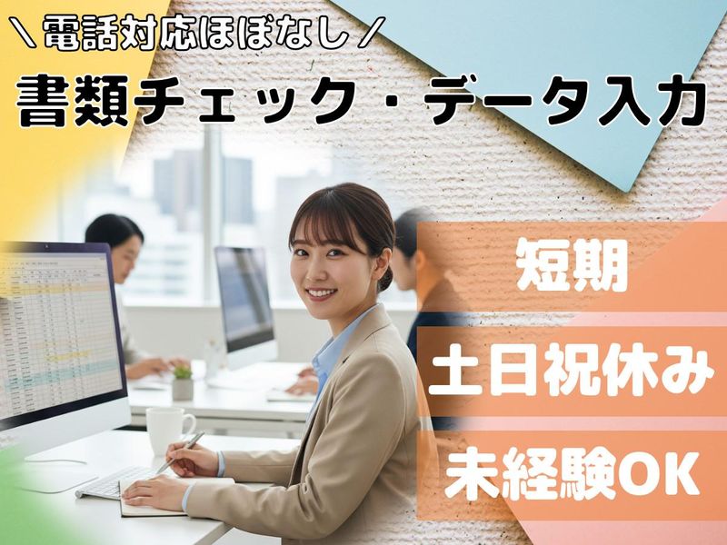 仕事内容 【アピールポイント】 ✅電話対応ほぼナシ!コツコツ集中できる環境! ✅12/15~春までの期間限定短期ワーク! ✅未経験から事務デビューを応援!充実の研修! ✅完全土日祝休み&残業少なめ 【仕事内容】 \年末年始~春までの期間限定!オフィスワークデビューに最適!/ 書類のチェックやデータ入力、社内メールでの連絡などがメインの、簡単な事務サポートをお願いします! お客様との電話対応はほとんどありません! <具体的なお仕事> ✨書類のチェック・作成補助 決まったフォーマットに沿って、内容を確認したり、簡単な書類を作成したりします。 ✨データ入力 専用システムに、情報をコツコツ入力していきます。 ✨社内メール対応 部署内での連絡事項などをメールでやり取りします。(週に数回、簡単な電話取次ぎあり) <安心ポイント> ◎しっかりとした研修があるので、事務のお仕事が全く初めての方でも大丈夫! ◎わからないことがあっても、周りの先輩が丁寧にサポートしてくれます! ※就業後、上記業務から変更はありません。 ///////////////// <電話でのお問い合わせ> *0120-222-606* までお問い合わせください。 ///////////////// ~ここがポイント~ ✅電話対応ほぼナシ!コツコツ集中できる環境 ―――――――――――――――― 「電話応対はちょっと苦手…」という方もご安心を!お客様との電話はなく、社内メールでのやり取りが中心。自分のペースで、データ入力や書類チェックに集中できます。 ✅12/15~春までの期間限定ワーク ―――――――――――――――― 「次の仕事が決まるまで」「春までの期間だけ働きたい」そんなあなたにピッタリ!期間は4/17までですが、「3月末まで」「4/10まで」など、終了時期の相談も可能です。 ✅未経験から事務デビューを応援!充実の研修 ―――――――――――――――― 特別なスキルや経験は一切不要!入社後の丁寧な研修で、PCの基本操作からしっかり学べます。「事務職に挑戦してみたい」というあなたの第一歩を応援します。 ✅完全土日祝休み&残業少なめ ―――――――――――――――― カレンダー通りのお休みで、週末はしっかりリフレッシュ!年末年始もお休みです。残業も月10~15時間程度と少なめで、「残業はできない」という方も相談OKです。