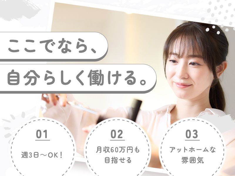 アピールポイント 【特徴&求人の魅力】 ●特徴01|自分のペースで働ける〇 ・平日ご対応いただく件数は2~3名程度! 無理なく働くことが可能! ・基本的に新規のお客様 フリーのお客様を 優先的にお任せしていきたいと思います ・勤務時間は自由なので働きやすく、 子育て中の方も活躍しています。 もちろん副業・WワークもOK! ●特徴02|個性を我慢しなくてOK! 髪型・髪色自由!さらに、 ネイルやピアス、ひげもOK! あなたらしく働ける環境です〇 ●特徴03|集客は好きなスタイルでOK! 集客は自由なスタイルで行えます。 当サロンのスタイリストとしてお客様を 集めても、個人のSNSを使ってもOKです! =・=・=・=・=・=・=・= 「お気に入り」で保存! いつでも求人を確認できます〇 =・=・=・=・=・=・=・=