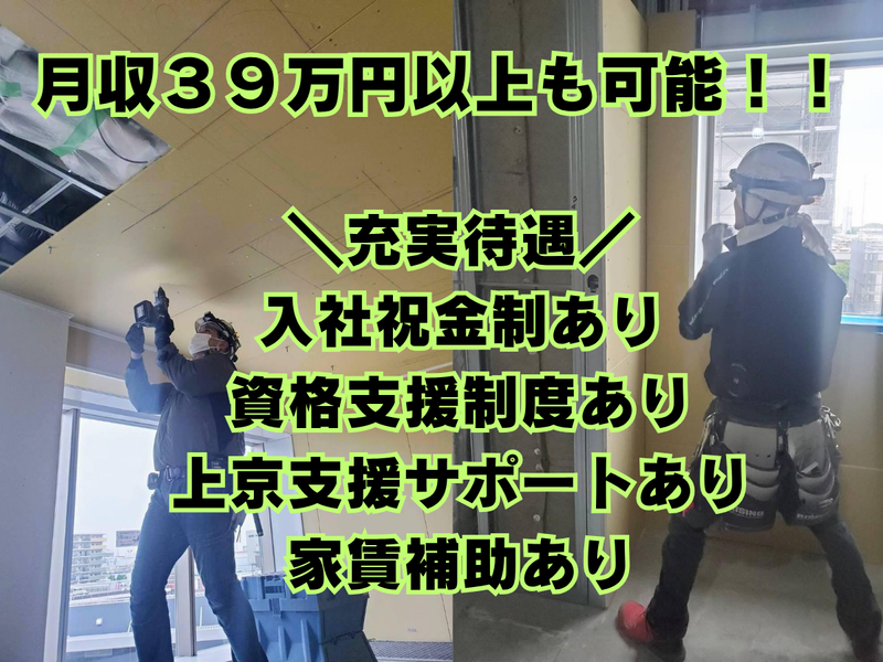 仕事内容 ≪内装仕上げ工事スタッフ募集! 一級技能士として更なる高みへ!≫ 【このお仕事のポイント】 ✅即戦力として活躍! これまでの豊富な経験と培われた技術を活かし、当社の中心メンバーとしてご活躍いただけます。 ✅安定した基盤とキャリアアップ 業績好調の安定企業で、更なる高みを目指せるキャリア形成が可能です。資格取得支援制度はもちろん、将来的な独立支援制度も活用いただけます。 ✅充実した待遇 月収39.6万円以上も可能。経験豊富な1級技能士の方には、入社祝い金や上京支援など、安心して長く働ける手厚いサポートをご用意しています。 ✅働きやすい環境! 八潮駅から徒歩7分とアクセス良好。直行直帰も可能で、ご自身のペースで効率的に働けます。 ✅スピーディーな選考 応募から内定まで平均1週間程度。面接は1回のみと、迅速な選考であなたの貴重な時間を大切にします。入社日の調整も柔軟に対応いたします。 【仕事内容詳細】 オフィスビル、マンション、商業施設など、多岐にわたる大規模プロジェクトの内装仕上げ工事をお任せします。 あなたの持つ1級技能士としての専門性と技術を存分に発揮してください。 具体的には、 ◆軽量鉄骨材で建物内の天井や壁の骨組みを作る「軽天下地処理」 ◆下地に石膏ボードなどを貼り付ける「ボード貼り工事」 がメインとなります。培われた高度な技術力で、現場をリードしてください。 【将来は独立も視野に】 培ってきた確かな技術を活かし、将来的な独立も視野に。 あなたの独立を全力でサポートする早期独立支援制度もございますので、お気軽にご相談ください。 HPにも掲載中です。ぜひご覧ください!! ↓ https://www.shirayurikensou.com/ ↑ リンクが機能しておりません。 お手数ですが、URLをコピーしてブラウザで直接開いてください。